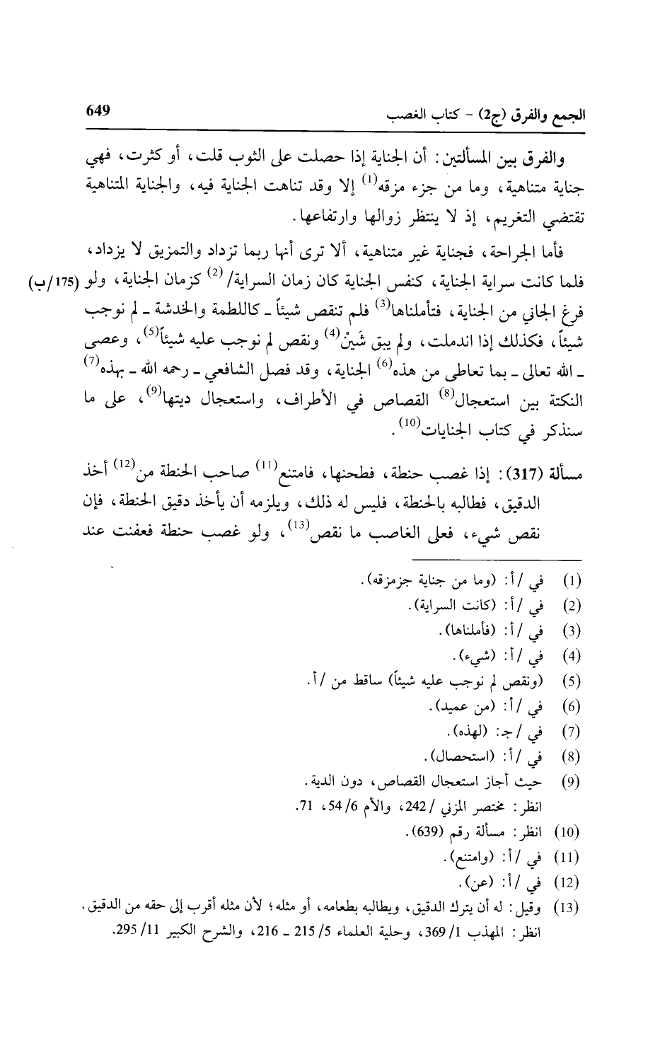 والفرق بين المسألتين: أن الجناية إذا حصلت على الثوب قلت، أو كثرت فهي جناية متناهية، وما من جزء مزقه إلا وقد تناهت الجناية فيه، والجناية المتناهية تقتضي التغريم، إذ لا ينتظر زوالها وارتفاعها.
