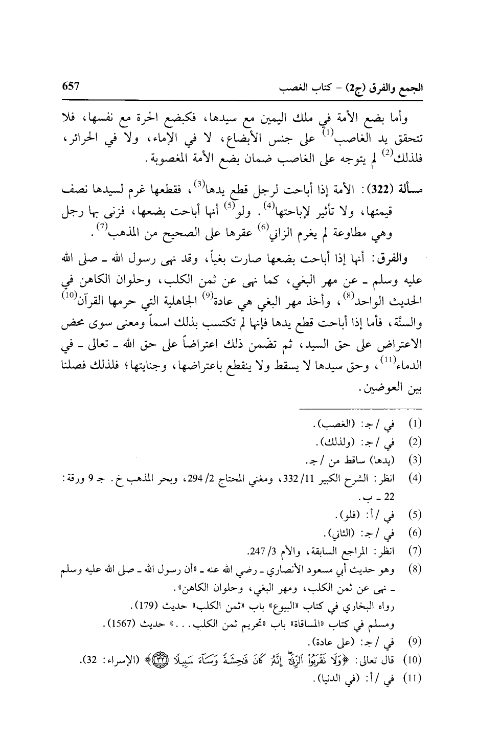 مسألة (٣٢٢): الأمة إذا أباحت لرجل قطع يدها، فقطعها غرم لسيدها نصف قيمتها، ولا تأثير لإباحتها. ولو أنها أباحت بضعها، فزنى بها رجل وهي مطاوعة لم يغرم الزاني عقرها على الصحيح من المذهب.