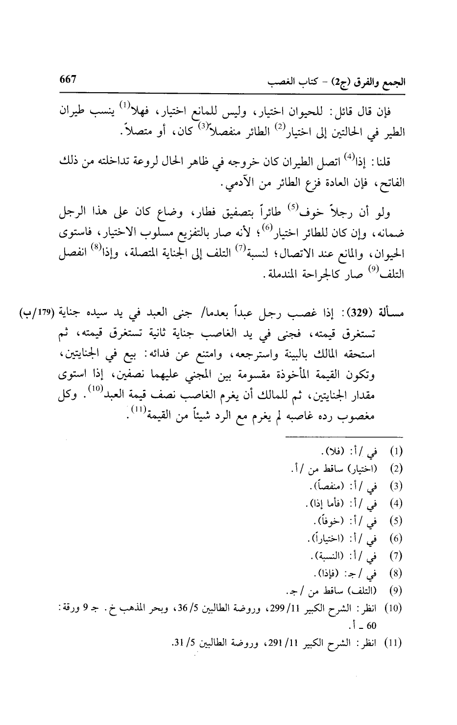 ولو أن رجلًا خوف طائرًا بتصفيق فطار، وضاع كان على هذا الرجل ضمانه، وإن كان للطائر اختيار؛ لأنه صار بالتفزيع مسلوب الاختيار، فاستوي الحيوان، والمانع عند الاتصال؛ لنسبة التلف إلى الجناية المتصلة، وإذا انفصل التلف صار كالجراحة المندملة.