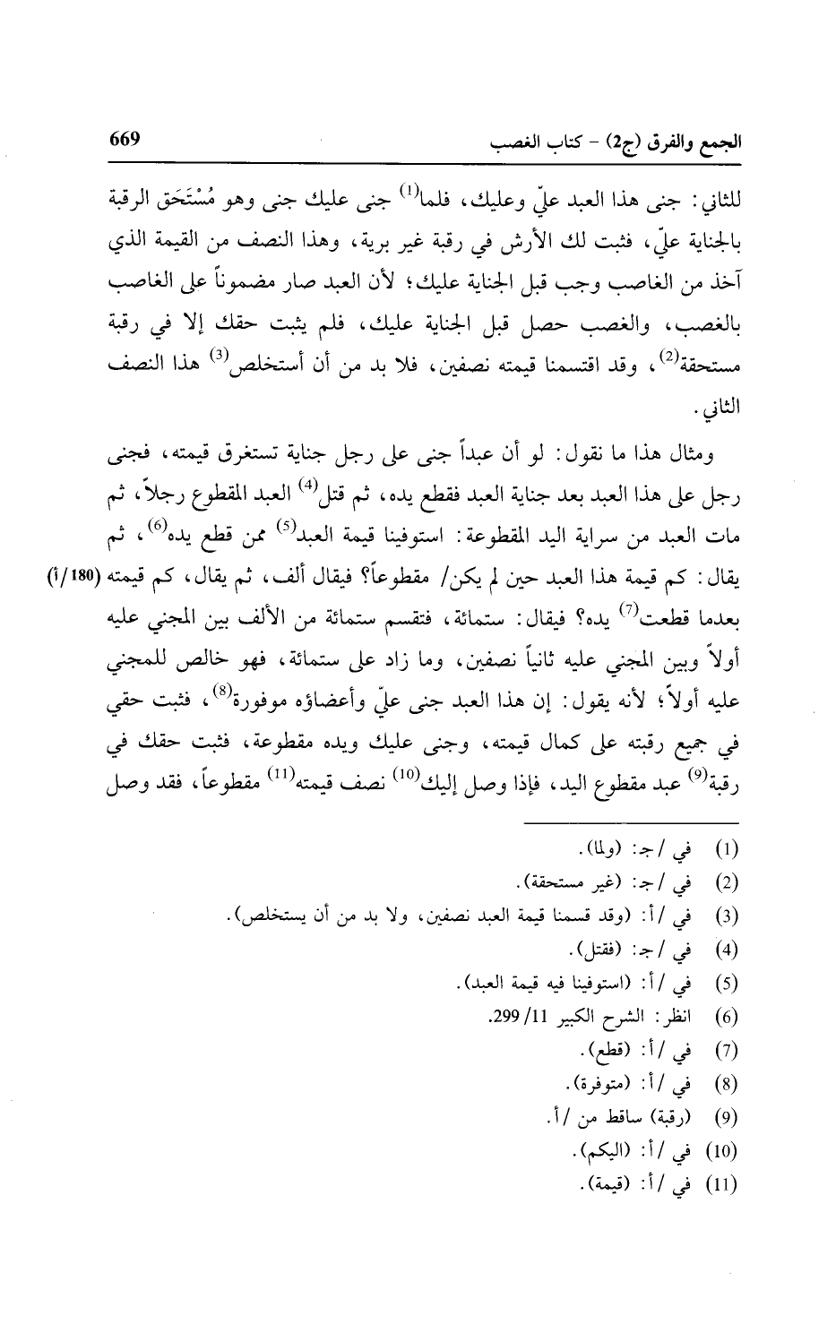 ومثال هذا ما نقول: لو أن عبدًا جني على رجل جناية تستغرق قيمته، فجني رجل على هذا العبد بعد جناية العبد فقطع يده، ثم قتل العبد المقطوع رجلًا، ثم مات العبد من سراية اليد المقطوعة: استوفينا قيمة العبد ممن قطع يده، ثم يقال: كم قيمة هذا العبد حين لم يكن/ (١٨٠ - أ) مقطوعًا؟ فيقال ألف، ثم يقال، كم قيمته بعدما قطعت يده؟ فيقال: ستمائة، فتقسم ستمائة من الألف بين المجني عليه أولًا وبين المجني عليه ثانيًا نصفين، وما زاد على ستمائة، فهو خالص للمجني عليه أولًا؛ لأنه يقول: إن هذا العبد جني علي وأعضاؤه موفورة، فثبت حقي في جميع رقبته على كمال قيمته، وجني عليك ويده مقطوعة، فثبت حقك في رقبة عبد مقطوع اليد، فإذا وصل إليك نصف قيمته مقطوعًا، فقد وصل
