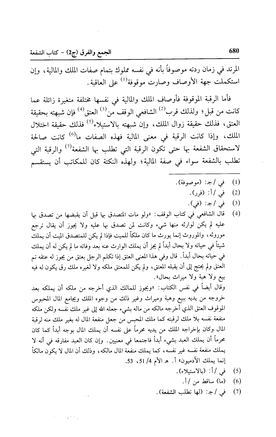 فأما الرقبة الموقوفة فأوصاف الملك والمالية في نفسها مختلفة متغيرة زائلة عما كانت من قبل؛ ولذلك قرب الشافعي الوقف من العتق فإن شبهته بحقيقة العتق، فذلك حقيقة زوال الملك، وإن شبهته بالاستيلاء فذلك حقيقة اختلال الملك، وإذا كانت الرقبة في معنى المالية فهذه الصفات ما كانت صالحة لاستحقاق الشفعة بها حتى تكون الرقبة التي تطلب بها الشفعة والرقبة التي تطلب بالشفعة سواء في صفة المالية؛ ولهذه النكتة كان للمكاتب أن يستقسم