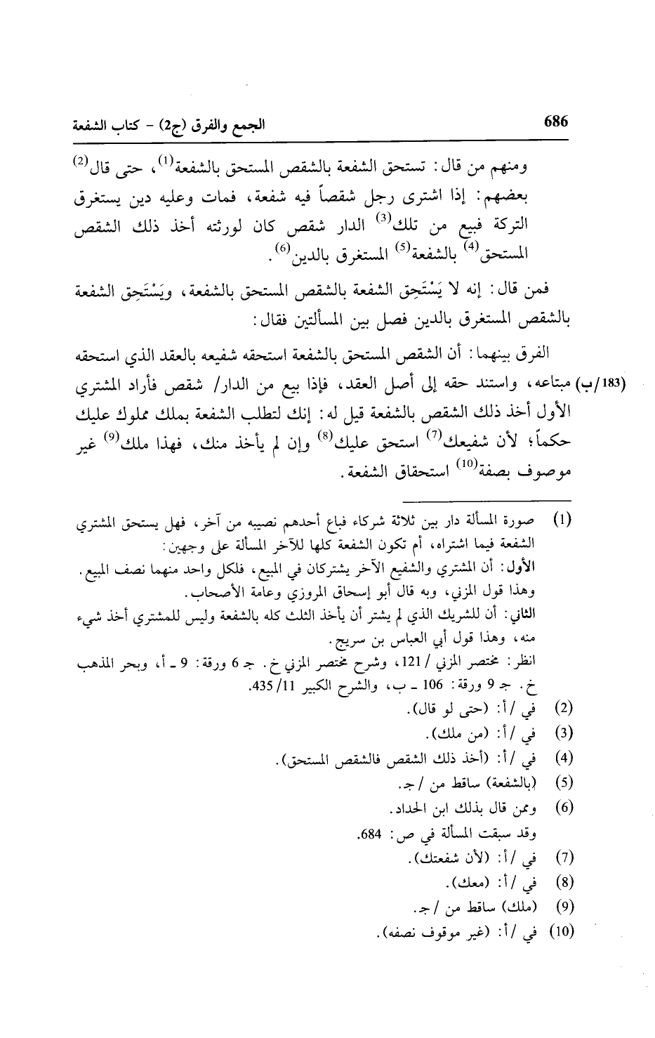 ومنهم من قال: تستحق الشفعة بالشقص المستحق بالشفعة، حتى قال بعضهم: إذا اشترى رجل شقصًا فيه شفعة، فمات وعليه دين يستغرق التركة فبيع من تلك الدار شقص كان لروثته أخذ ذلك الشقص المستحق بالشفعة المستغرق بالدين.