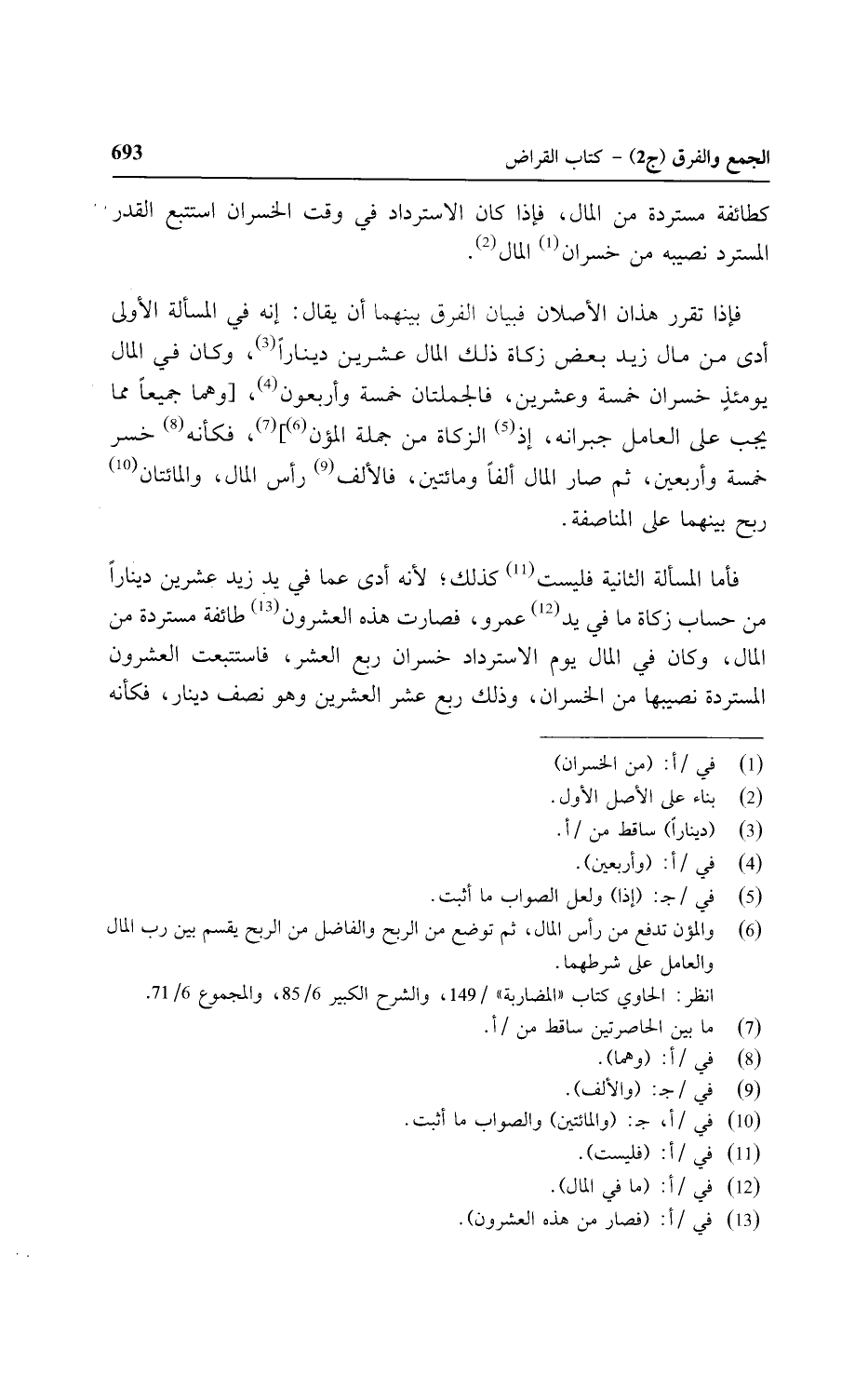 فإذا تقرر هذان الأصلان فبيان الفرق بينهما أن يقال: إنه في المسألة الأولى أدى من مال زيد بعض زكاة ذلك المال عشرين دينارًا، وكان في المال يومئذٍ خسران خمسة وعشرين، فالجملتان خمسة وأربعون، [وهما جميعًا مما يجب على العامل جبرانه، إذ الزكاة من جملة المؤن]، فكأنه خسر خمسة وأربعين، ثم صار المال ألفًا ومائتين، فالألف رأس المال، والمائتان ربح بينهما على المناصفة.
