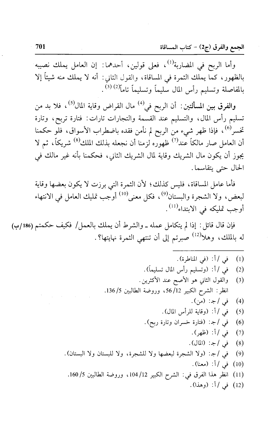 والفرق بين المسألتين: أن الربح في مال القراض وقاية المال, فلا بد من تسليم رأس المال, والتسليم عند القسمة والتجارات تارات: فتارة تربح, وتارة تخسر, فإذا ظهر شيء من الربح لم نأمن فقده باضطراب الأسواق, فلو حكمنا أن العامل صار مالكا عند ظهوره لزمنا أن نجعله بذلك الملك شريكا, ثم لا يجوز أن يكون مال الشريك وقاية لمال الشريك الثاني, فحكمنا بأنه غير مالك في الحال حتى يتقاسما.