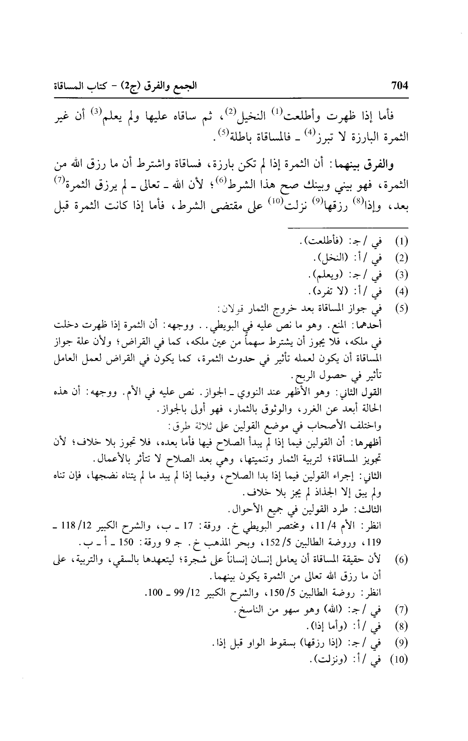 والفرق بينهما: أن الثمرة إذا لم تكن بارزة, فساقاة واشترط أن ما رزق الله من الثمرة, فهو بيني وبينك صح هذا الشرط؛ لأن الله - تعالى - لم يرزق الثمرة بعد, وإذا رزقها نزلت على مقتضى الشرط, فأما إذا كانت الثمرة قبل
