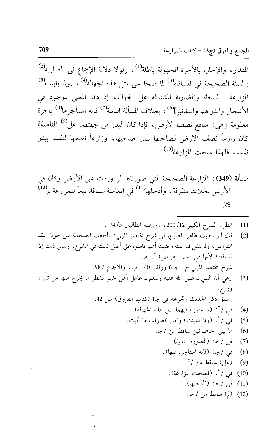 المقدار, والإجارة بالأجرة المجهولة باطلة, ولولا دلالة الإجماع في المضاربة والسنة الصحيحة في المساقاة لما صحا على مثل هذه الجهالة, [ولما باينت المزارعة: المساقاةوالمضاربة المشتملة على الجهالة, إذ هذا المعنى موجود في الأشجار والدراهم والدنانير] , بخلاف المسألة الثانية فإنه استأجرها بأجرة معلومة وهي: منافع نصف الأرض, فإذا كان البذر من جهتهما على المناصفة كان زارعا نصف الأرض لصاحبها ببذر صاحبها, وزارعا نصفها لنفسه ببذر نفسه فلهذا صحت المزارعة.