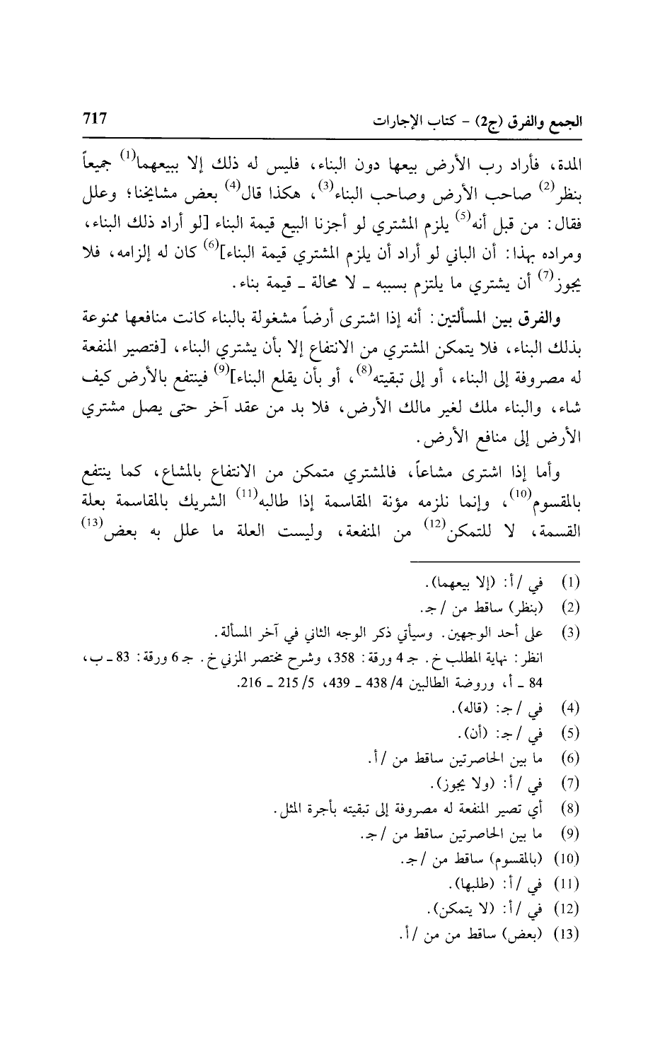 والفرق بين المسألتين: أنه إذا اشترى أرضا مشغولة بالبناء كانت منافعها ممنوعة بذلك البناء, فلا يتمكن المشتري من الانتفاع إلا بأن يشتري البناء, [فتصير المنفعة له مصروفة إلى البناء, أو إلى تبقيته, أو بأن يقلع البناء] فينتفع بالأرض كيف شاء، والبناء ملك لغير مالك الرض, فلابد من عقد آٌخر حتى يصل مشتري الأرض إلى منافع الأرض.