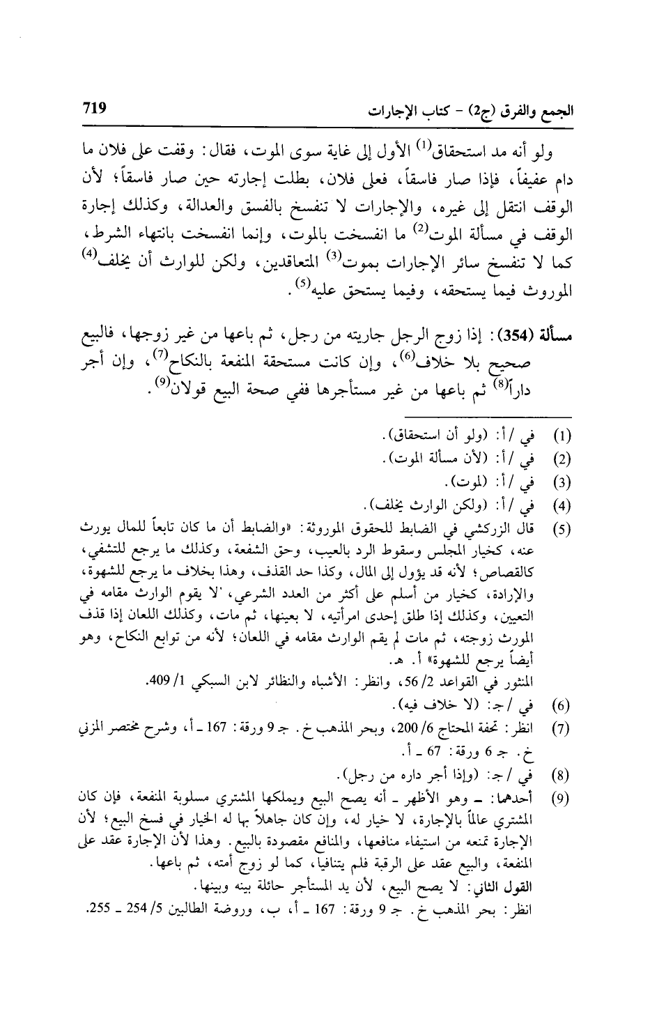 مسألة (٣٥٤): إذا زوج الرجل جاريته من رجل, ثم باعها من غير زوجها, فالبيع صحيح بلا خلاف, وإن كانت مستحقة المنفعة بالنكاح, وإن أجر دارا ثم باعها من غير مستأجرها ففي صحة البيع قولان.
