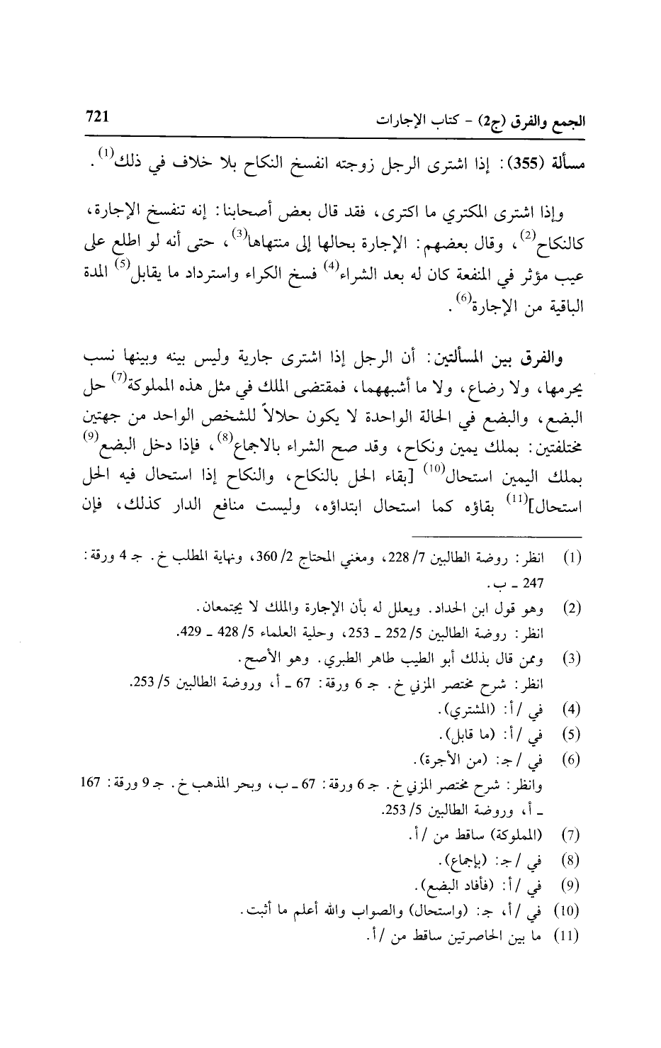 مسألة (٣٥٥): إذا اشترى الرجل زوجته انفسخ النكاح بلا خلاف في ذلك وإذا اشترى المكتري ما اكترى, فقد قال بعض أصحابنا: إنه تنفسخ الإجارة, كالنكاح, وقال بعضهم: الإجارة بحالها إلى منتهاها, حتى أنه لو اطلع على عيب مؤثر في المنفعة كان له بعد الشراء فسخ الكراء واسترداد ما يقابل المدة الباقية من الإجارة.