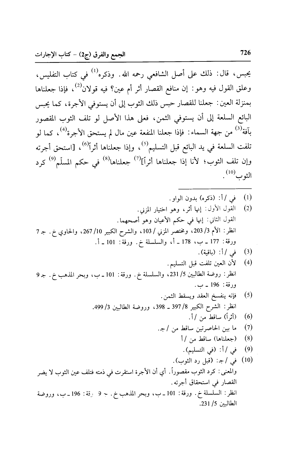 يحبس, قال: ذلك على أصل الشافعي رحمه الله. وذكره في كتاب التفليس, وعلق القول فيه وهو: إن منافع القصار أثر أم عين؟ فيه قولان, فإذا جعلناها بمنزلة العين: جعلنا للقصار حبس ذلك الثوب إلى أن يستوفي الأجرة, كما يحبس البائع السلعة إلى أن يستوفي الثمن, فعلى هذا الأصل لو تلف الثوب المقصور باٌفة من جهة السماء: فإذا جعلنا المنفعة عين مال لم يستحق الأجرة, كما لو تلفت السلعة في يد البائع قبل التسليم, وإذا جعلناها أثرا, [استحق أجرته وإن تلف الثوب, لأنا إذا جعلناها أثرا] جعلناها في حكم المسلم كرد الثوب.
