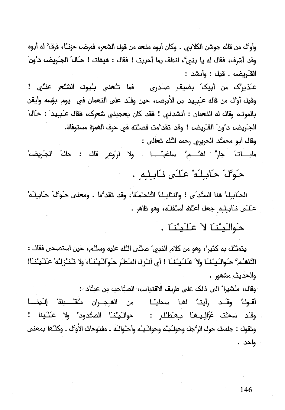يتمثل به كثيرا وهو من كلام النبي صلى الله عليه وسلم حين استصحى فقال: اللهم حوالينا ولا علينا! أي أنزل المطر حوالينا ولا تنزله علينا! والحديث مشهور.