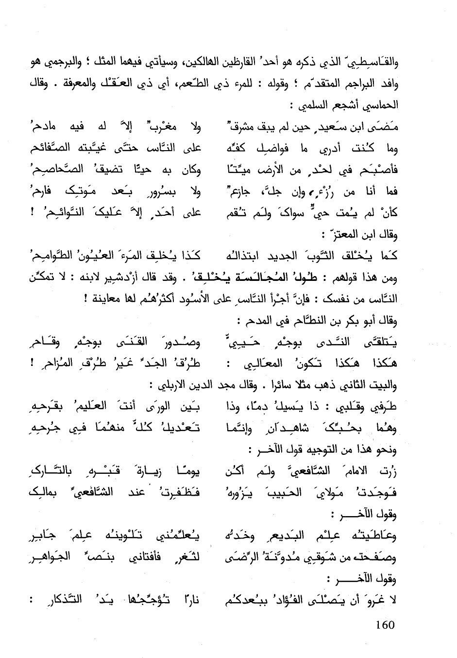 والقاسطي الذي ذكره هو أحد القارضين الهالكين، وسيأتي فيهما المثل؛ والبرجمي هو وافد البراجم المتقدم؛ وقوله: للمرء ذي العقل والمعرفة. وقال الحماسي أشجع السلمي: