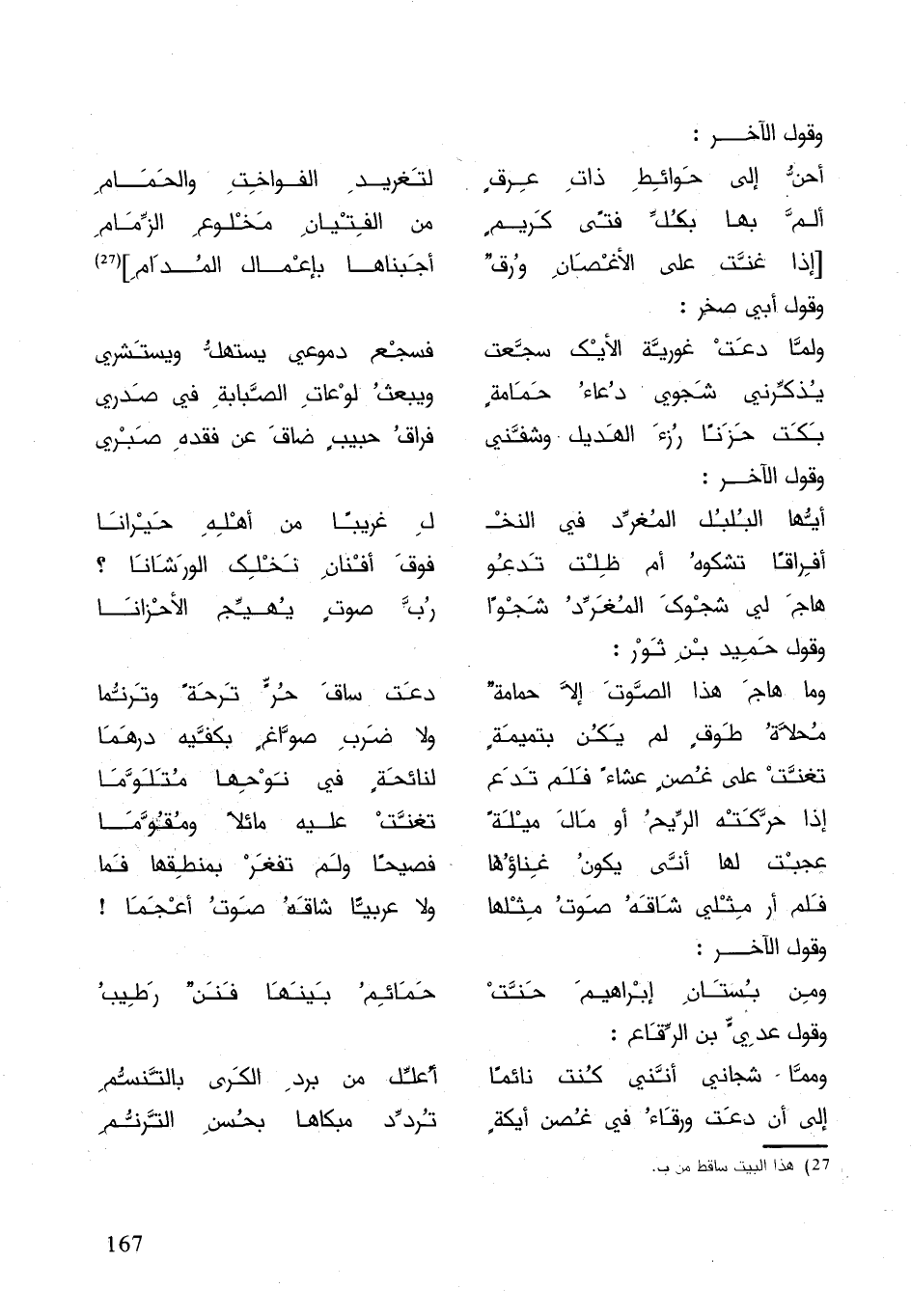 أحن إلى حوائط ذات عرقٍ ... لتغريد الفواخت والحمامِ