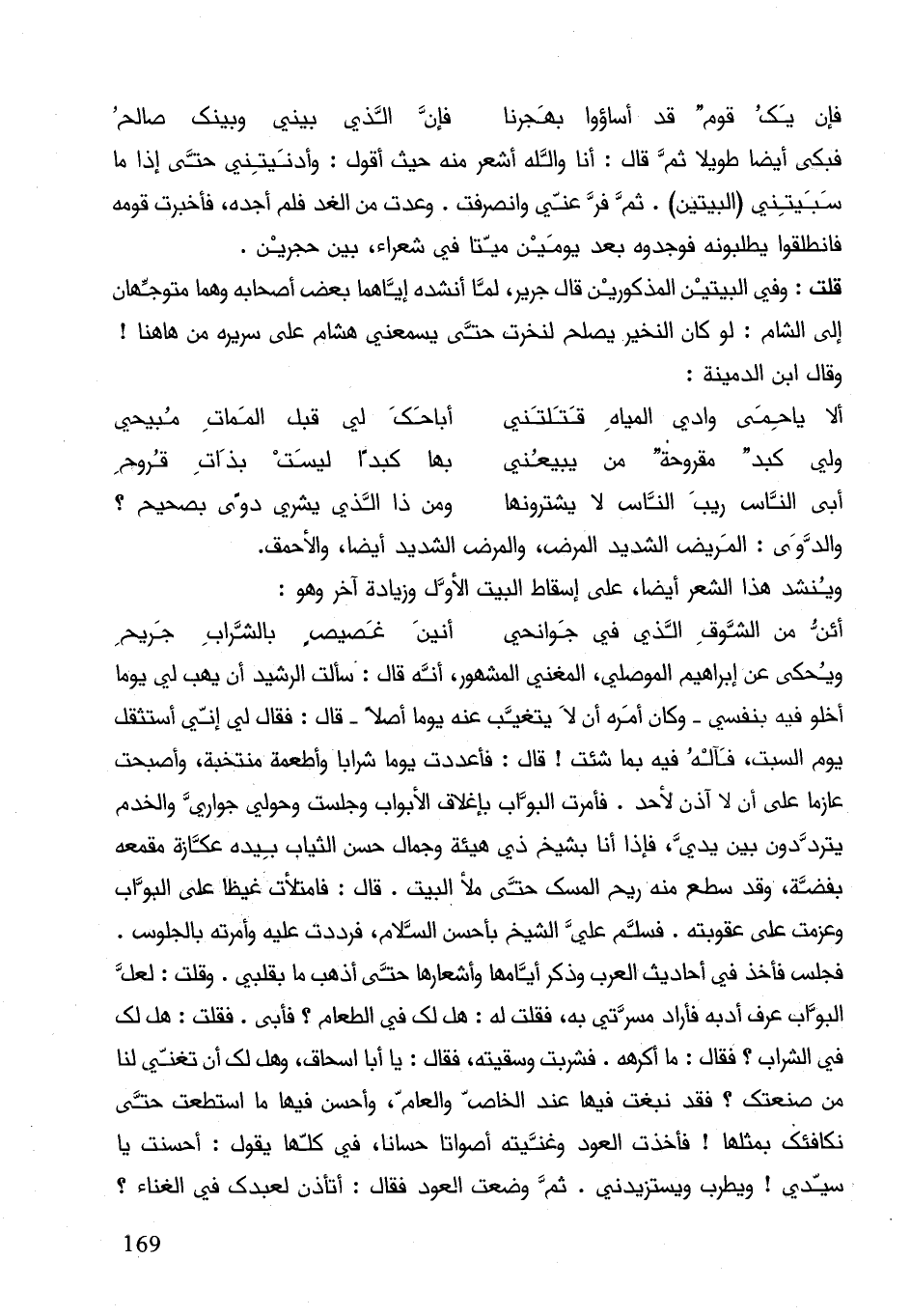 ويحكى عن إبراهيم الموصلي المغني المشهور أنه قال: سألت الرشيد أن يهب لي يوما أخلو فيه بنفسي وكان أمره أن لا يتغيب عنه يوما أصلا قال: فقال لي إني أستثقل يوم السبت فآله فيه بما شئت! قال: فأعددت يوما شرابا وأطعمة منتخبة وأصبحت عازما على أن لا آذن لأحد. فأمرت البواب بإغلاق الأبواب وجلست وحولي جواري والخدم يترددون بين يدي فإذا أنا بشيخ ذي هيئة وجمال حسن الثياب بيده عكازة مقمعة بفضة وقد سطع منه ريح المسك حتى ملأ البيت. قال: فامتلأت غيظا على البوابو عزمت على غقوبته. فسلم علي الشيخ بأحسن السلام فرددت عليه وأمرته بالجلوس. فجلس فأخذ في أحاديث العرب وذكر أيامها وأشعارها حتى أذهب ما بقلبي. وقلت: لعل البواب عرف أدبه فأراد مسرتي به فقلت له: هل لك في الطعام؟ فأبى. فقلت: هل لك في الشراب؟ فقال: ما أكرهه. فشربت وسقيته فقال: يا أبا إسحاق وهل لك أن تغني لنا من صنعك؟ فقد نبغت فيها عند الخاص والعام وأحسن فيها ما استطعت حتى نكافئك بمثلها! فأخذت العود وغنيته أصواتا حسانا في كلها يقول: أحسنت يا سيدي! ويطرب ويستزيدني. ثم وضعت العود فقال: أتأذن لعبدك في الغناء؟