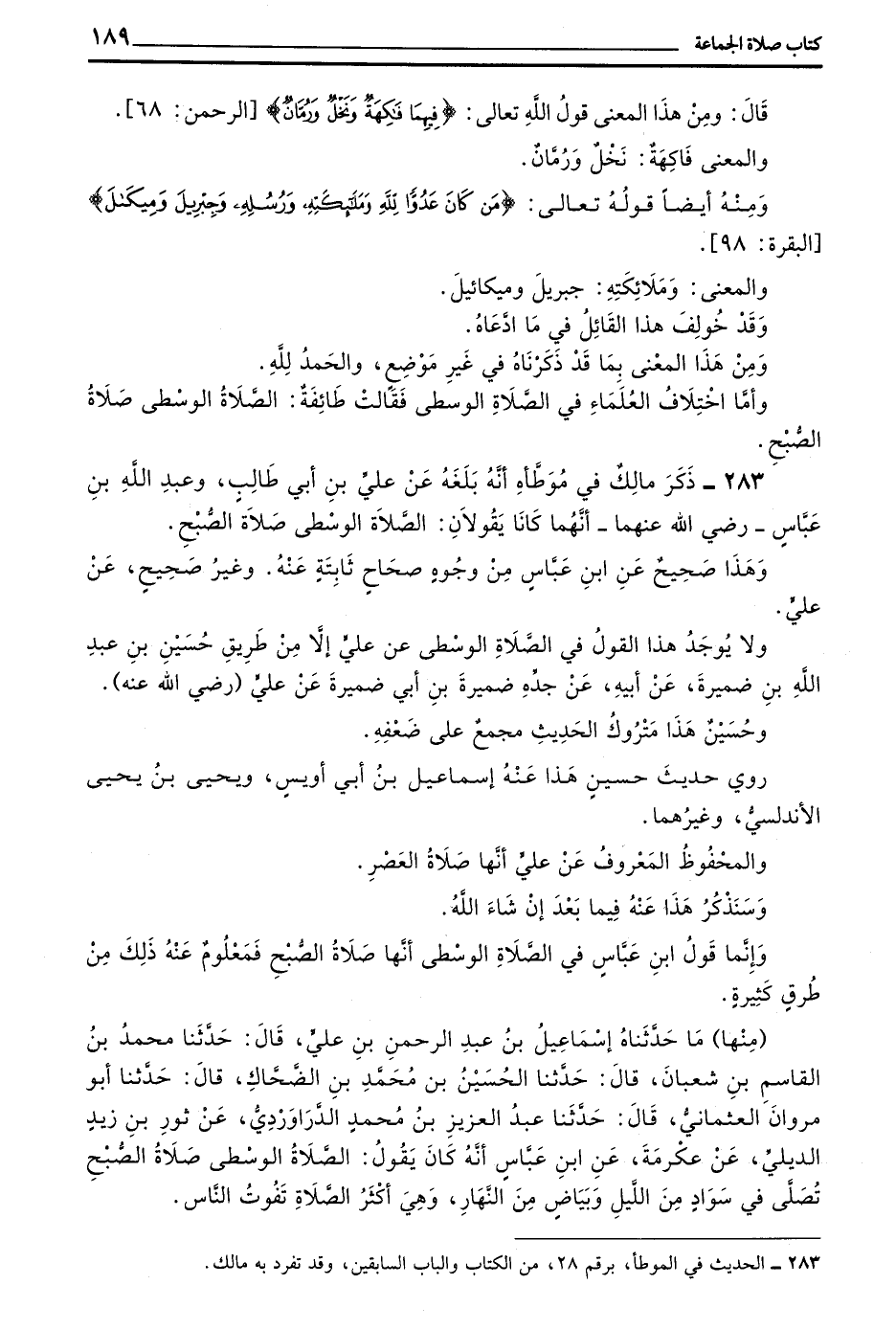 283 - ذكر مالك في موطأه أَنَّهُ بَلَغَهُ عَنْ عَلِيِّ بْنِ أَبِي طَالِبٍ وَعَبْدِ اللَّهِ بْنِ عَبَّاسٍ رَضِيَ اللَّهُ عَنْهُمَا أَنَّهُمَا كَانَا يَقُولَانِ الصَّلَاةُ الْوُسْطَى صَلَاةُ الصُّبْحِ
