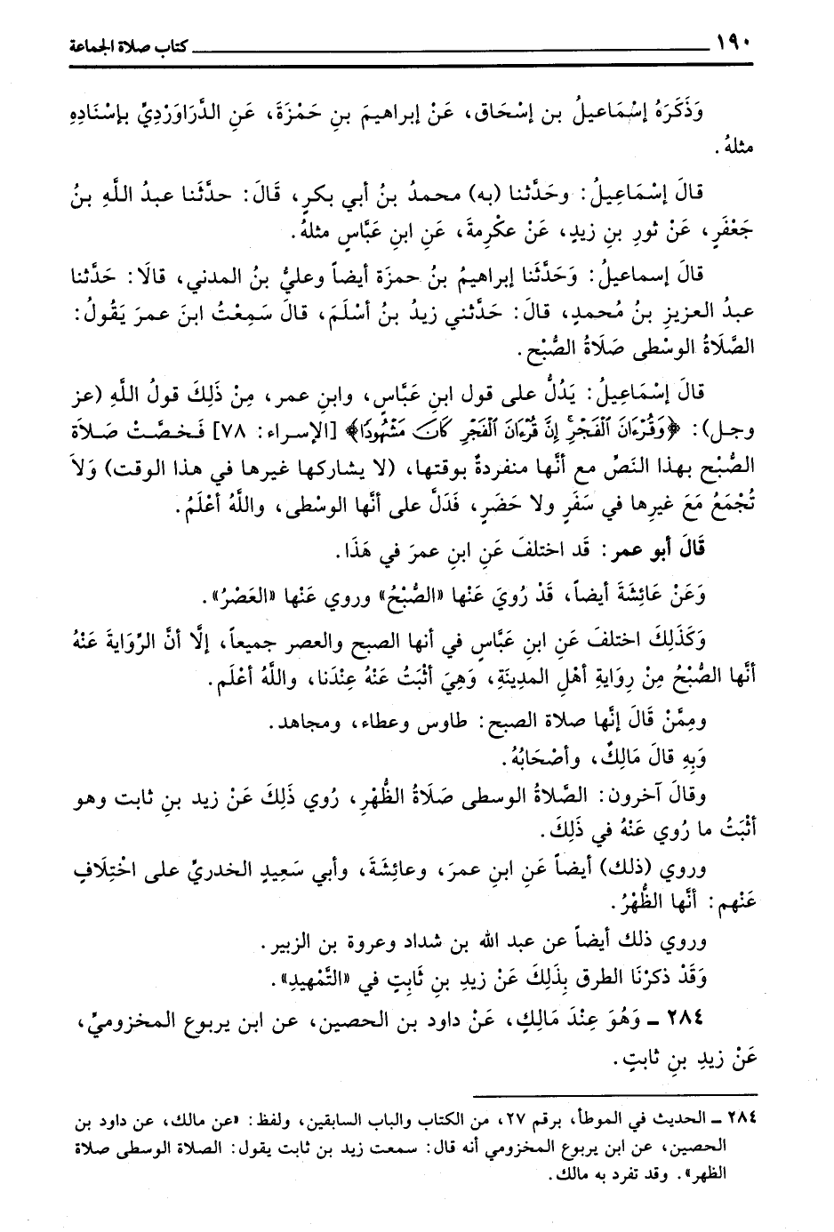 قَالَ إِسْمَاعِيلُ وَحَدَّثَنَا إِبْرَاهِيمُ بْنُ حَمْزَةَ أَيْضًا وَعَلِيُّ بْنُ الْمَدَنِيِّ قَالَا حَدَّثَنَا عَبْدُ الْعَزِيزِ بْنُ مُحَمَّدٍ قَالَ حَدَّثَنِي زَيْدُ بن أسلم قال سمعت بن عُمَرَ يَقُولُ الصَّلَاةُ الْوُسْطَى صَلَاةُ الصُّبْحِ