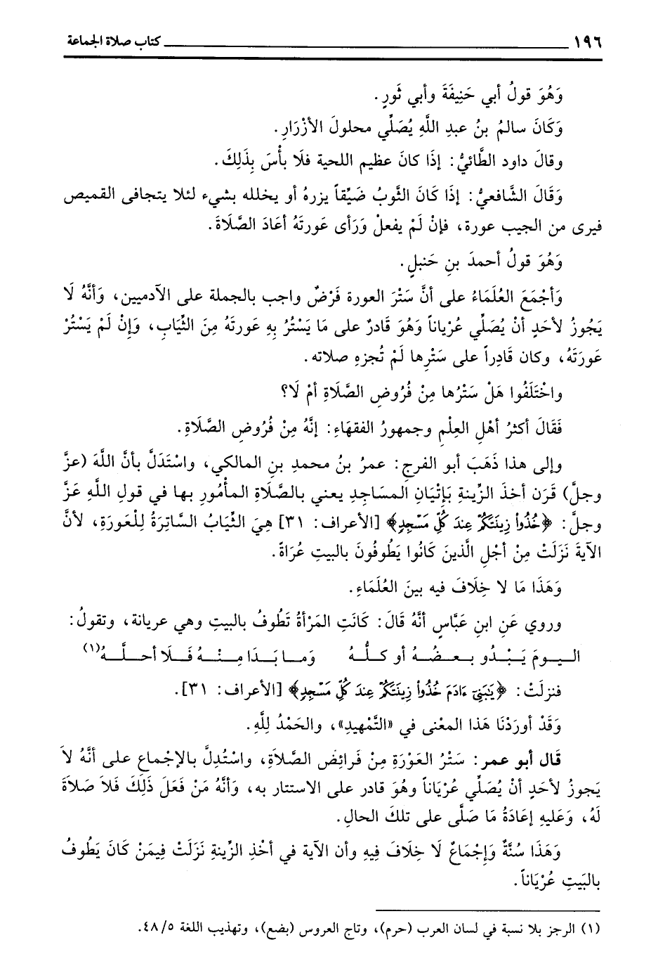 وَإِلَى هَذَا ذَهَبَ أَبُو الْفَرَجِ عُمَرُ بْنُ مُحَمَّدِ بْنِ الْمَالِكِيِّ وَاسْتَدَلَّ بِأَنَّ اللَّهَ (عَزَّ وَجَلَّ) قَرَنَ أَخْذَ الزِّينَةِ بِإِتْيَانِ الْمَسَاجِدِ يَعْنِي بِالصَّلَاةِ الْمَأْمُورِ بِهَا فِي قَوْلِ اللَّهِ عَزَّ وَجَلَّ (خُذُوا زِينَتَكُمْ عِنْدَ كُلِّ مَسْجِدٍ) الْأَعْرَافِ 31 هِيَ الثِّيَابُ السَّاتِرَةُ لِلْعَوْرَةِ لِأَنَّ الْآيَةَ نَزَلَتْ مِنْ أَجْلِ الَّذِينَ كَانُوا يَطُوفُونَ بِالْبَيْتِ عُرَاةً