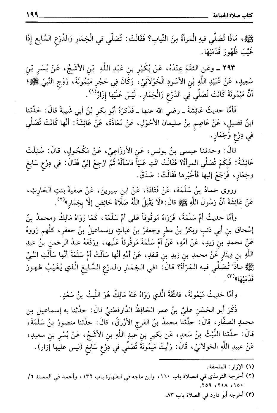 ذَكَرَ أَبُو الْحَسَنِ عَلِيُّ بْنُ عُمَرَ الْحَافِظُ الدَّارَقُطْنِيُّ قَالَ حَدَّثَنَا بِهِ إِسْمَاعِيلُ بْنُ مُحَمَّدٍ الصَّفَّارُ قَالَ حَدَّثَنَا مُحَمَّدُ بْنُ الْفَرَجِ الْأَزْرَقُ قَالَ حَدَّثَنَا مَنْصُورُ بْنُ سَلَمَةَ قَالَ حَدَّثَنَا اللَّيْثُ بْنُ سَعْدٍ عَنْ بُكَيْرِ بْنِ عَبْدِ اللَّهِ بْنِ الْأَشَجِّ عَنْ بُسْرِ بْنِ سَعِيدٍ عَنْ عُبَيْدِ اللَّهِ الْخَوْلَانِيِّ قَالَ رَأَيْتُ مَيْمُونَةَ تُصَلِّي فِي دِرْعٍ سَابِغٍ (لَيْسَ عَلَيْهَا إِزَارٌ