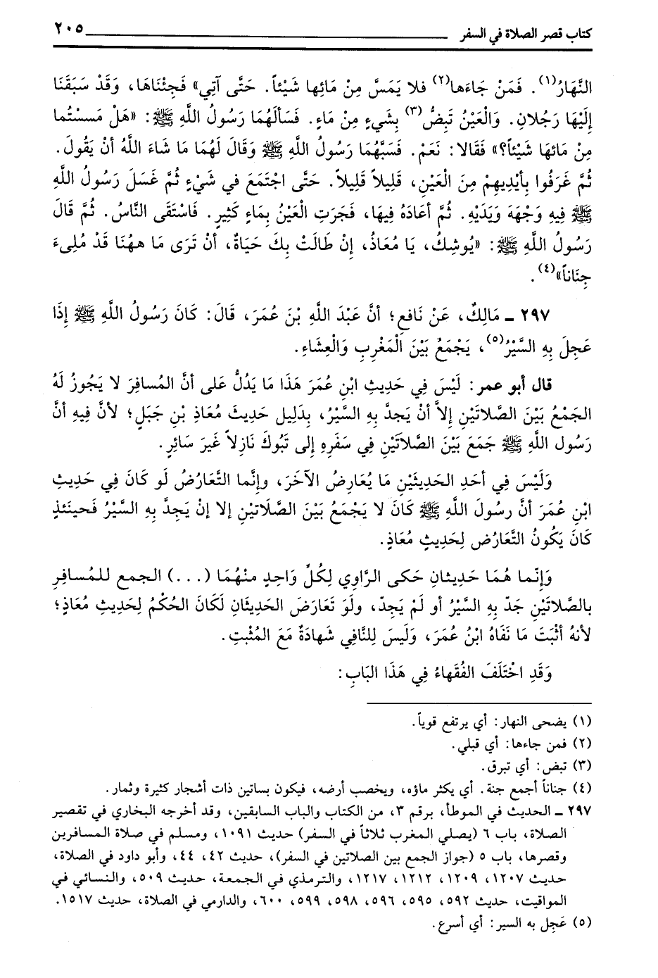 297 - مَالِكٌ عَنْ نَافِعٍ أَنَّ عَبْدَ اللَّهِ بْنَ عُمَرَ قَالَ كَانَ رَسُولُ اللَّهِ صَلَّى اللَّهُ عَلَيْهِ وَسَلَّمَ إِذَا عَجِلَ بِهِ السَّيْرُ يَجْمَعُ بَيْنَ الْمَغْرِبِ وَالْعِشَاءِ