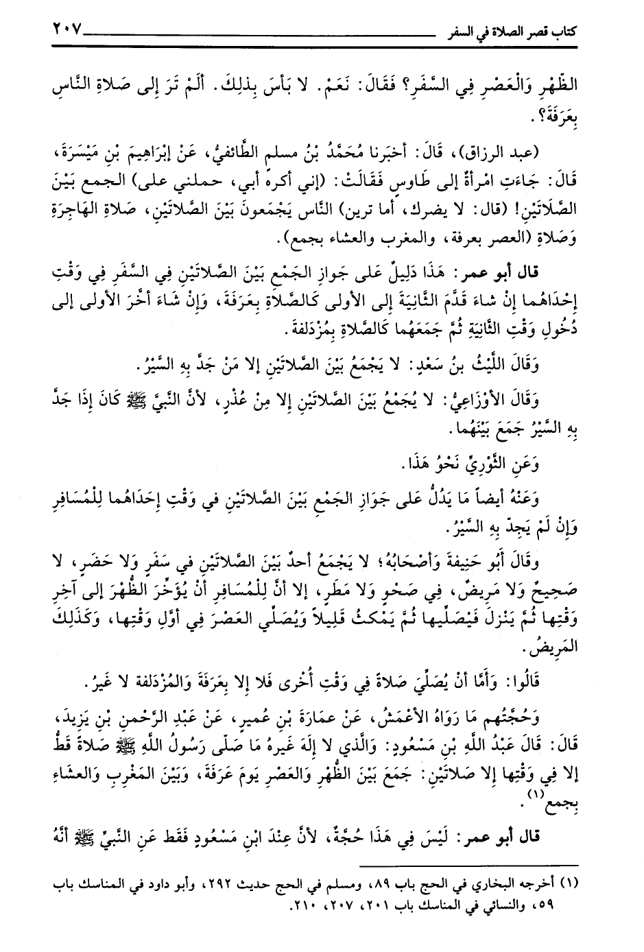 (عَبْدُ الرَّزَّاقِ) قَالَ أَخْبَرَنَا مُحَمَّدُ بْنُ مُسْلِمٍ الطَّائِفِيُّ عَنْ إِبْرَاهِيمَ بْنِ مَيْسَرَةَ قَالَ جَاءَتِ امْرَأَةٌ إِلَى طَاوُسٍ فَقَالَتْ (إِنِّي أَكْرَهُ أَبِي حَمَلَنِي عَلَى) الْجَمْعِ بَيْنَ الصَّلَاتَيْنِ! (قَالَ لَا يَضُرُّكِ أَمَا تَرَيْنَ) النَّاسَ يَجْمَعُونَ بَيْنَ الصَّلَاتَيْنِ صَلَاةِ الْهَاجِرَةِ وَصَلَاةِ (الْعَصْرِ بِعَرَفَةَ وَالْمَغْرِبِ وَالْعِشَاءِ بِجَمْعٍ)