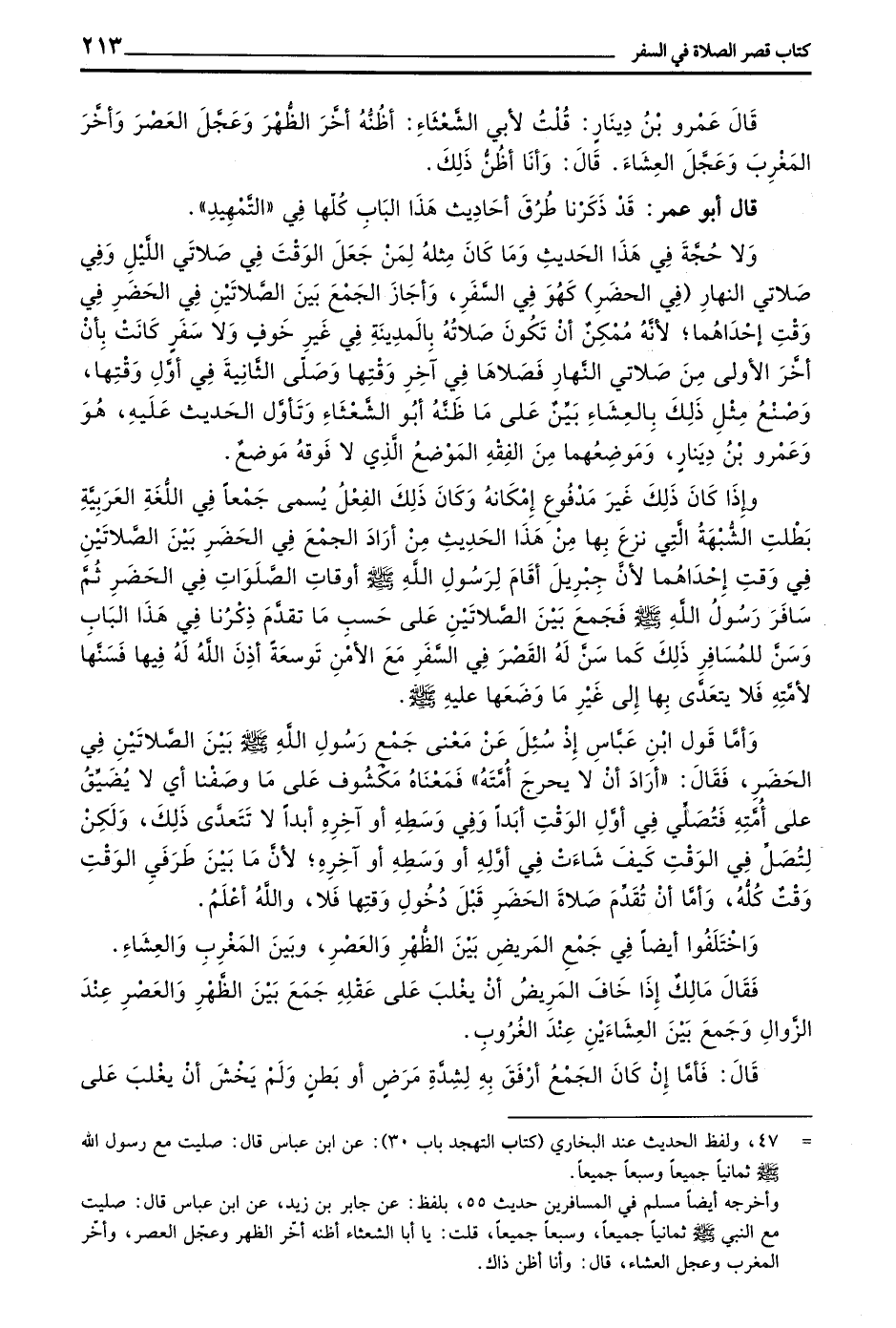 وَلَا حُجَّةَ فِي هَذَا الْحَدِيثِ وَمَا كَانَ مِثْلَهُ لِمَنْ جَعَلَ الْوَقْتَ فِي صَلَاتَيِ اللَّيْلِ وَفِي صَلَاتَيِ النَّهَارِ (فِي الْحَضَرِ) كَهُوَ فِي السَّفَرِ وَأَجَازَ الْجَمْعَ بَيْنَ الصَّلَاتَيْنِ فِي الْحَضَرِ فِي وَقْتِ إِحْدَاهُمَا لِأَنَّهُ مُمْكِنٌ أَنْ تَكُونَ صَلَاتُهُ بِالْمَدِينَةِ فِي غَيْرِ خَوْفٍ وَلَا سَفَرٍ كَانَتْ بِأَنْ أَخَّرَ الْأُولَى مِنْ صَلَاتَيِ النَّهَارِ فَصَلَّاهَا فِي آخِرِ وَقْتِهَا وَصَلَّى الثَّانِيَةَ فِي أَوَّلِ وَقْتِهَا وَصُنْعُ مِثْلِ ذَلِكَ بِالْعِشَاءِ بَيِّنٌ عَلَى مَا ظَنَّهُ أَبُو الشَّعْثَاءِ وَتَأَوَّلَ الْحَدِيثَ عَلَيْهِ هُوَ وَعَمْرُو بْنُ دِينَارٍ وَمَوْضِعُهُمَا مِنَ الْفِقْهِ الْمَوْضِعُ الَّذِي لَا فَوْقَهُ مَوْضِعٌ