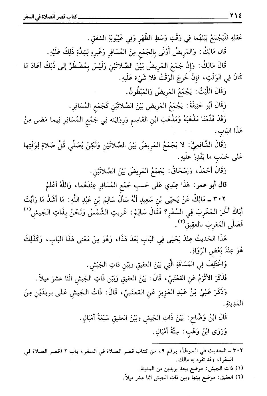 302 - مَالِكٌ عَنْ يَحْيَى بْنِ سَعِيدٍ أَنَّهُ سَأَلَ سَالِمَ بْنَ عَبْدِ اللَّهِ مَا أَشَدُّ مَا رَأَيْتَ أَبَاكَ أَخَّرَ الْمَغْرِبَ فِي السَّفَرِ فَقَالَ سَالِمٌ غَرَبَتِ الشَّمْسُ وَنَحْنُ بِذَاتِ الْجَيْشِ فَصَلَّى الْمَغْرِبَ بِالْعَقِيقِ