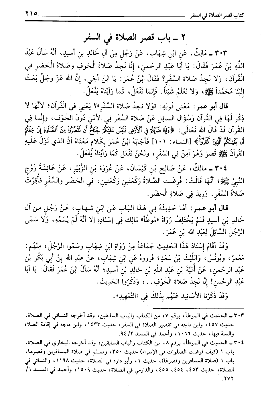 304 - مَالِكٌ عَنْ صَالِحِ بْنِ كَيْسَانَ عَنْ عُرْوَةَ بْنِ الزُّبَيْرِ عَنْ عَائِشَةَ زَوْجِ النَّبِيِّ صَلَّى اللَّهُ عَلَيْهِ وَسَلَّمَ أَنَّهَا قَالَتْ فُرِضَتِ الصَّلَاةُ رَكْعَتَيْنِ رَكْعَتَيْنِ فِي الْحَضَرِ وَالسَّفَرِ فَأُقِرَّتْ صَلَاةُ السَّفَرِ وَزِيدَ فِي صَلَاةِ الْحَضَرِ