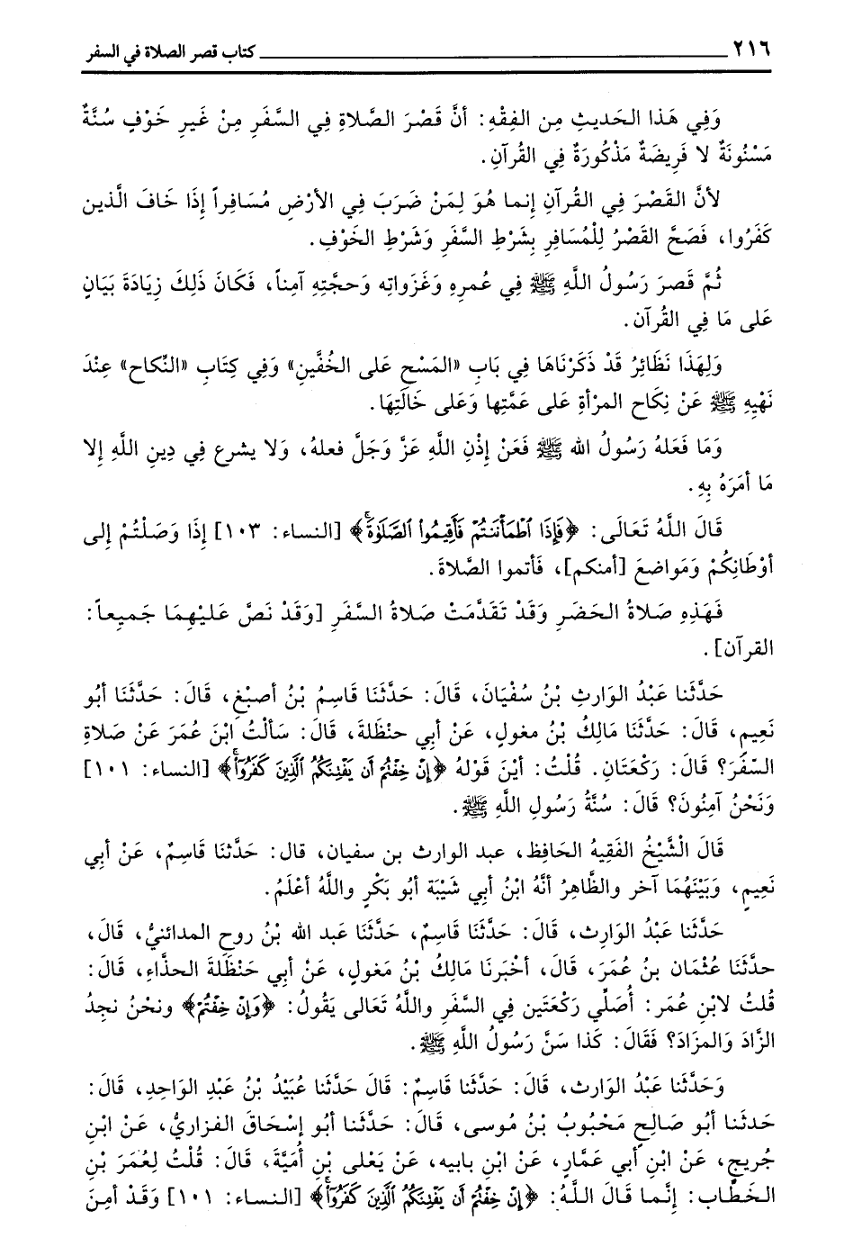 وَحَدَّثَنَا عَبْدُ الْوَارِثِ قَالَ حَدَّثَنَا قَاسِمٌ قَالَ حَدَّثَنَا عُبَيْدُ بْنُ عَبْدِ الْوَاحِدِ قَالَ حَدَّثَنَا أَبُو صَالِحٍ مَحْبُوبُ بْنُ مُوسَى قَالَ حَدَّثَنَا أبو إسحاق الفزاري عن بن جريج عن بن أبي عمار عن بْنِ بَابَيْهِ عَنْ يَعْلَى بْنِ أُمَيَّةَ قَالَ قُلْتُ لِعُمَرَ بْنِ الْخَطَّابِ إِنَّمَا قَالَ اللَّهُ (إِنْ خِفْتُمْ أَنْ يَفْتِنَكُمُ الَّذِينَ كَفَرُوا) النِّسَاءِ 101 وقد أمن