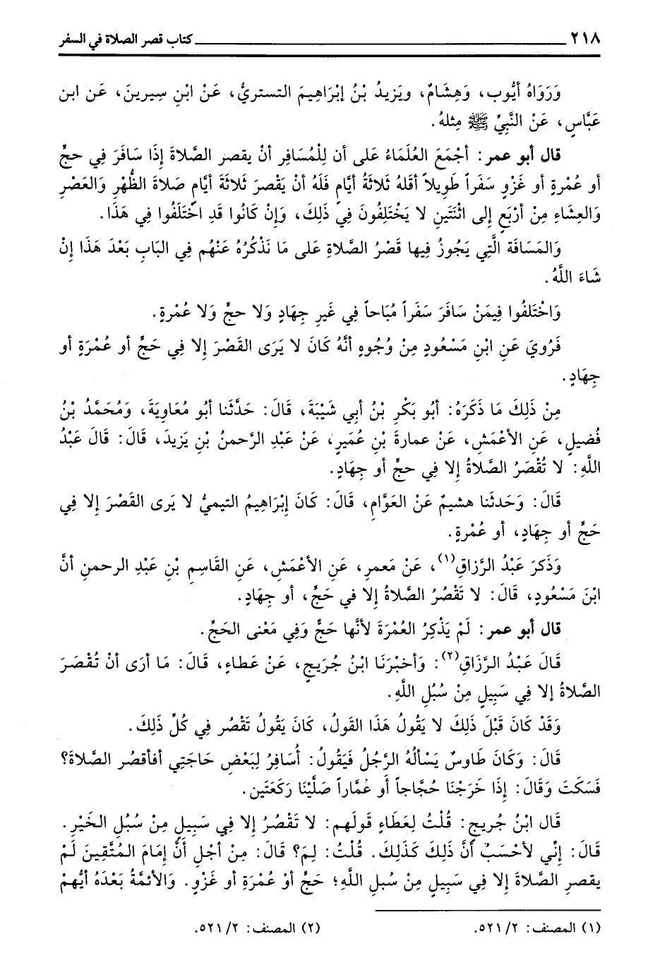 مِنْ ذَلِكَ مَا ذَكَرَهُ أَبُو بَكْرِ بْنُ أَبِي شَيْبَةَ قَالَ حَدَّثَنَا أَبُو مُعَاوِيَةَ وَمُحَمَّدُ بْنُ فُضَيْلٍ عَنِ الْأَعْمَشِ عَنْ عُمَارَةَ بْنِ عُمَيْرٍ عَنْ عَبْدِ الرَّحْمَنِ بْنِ يَزِيدَ قَالَ قَالَ عَبْدُ اللَّهِ لَا تُقْصَرُ الصَّلَاةُ إِلَّا فِي حَجٍّ أَوْ جِهَادٍ