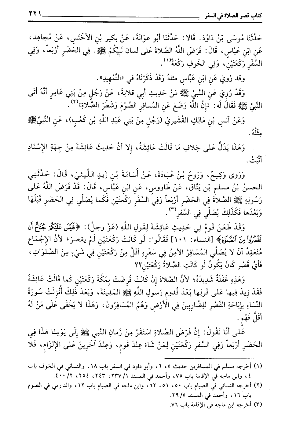 وَقَدْ طَعَنَ قَوْمٌ فِي حَدِيثِ عَائِشَةَ لِقَوْلِ اللَّهِ (عَزَّ وَجَلَّ) (فَلَيْسَ عَلَيْكُمْ جُنَاحٌ أَنْ تقصروا من الصلوة) النِّسَاءِ 101 فَقَالُوا لَوْ كَانَتْ رَكْعَتَيْنِ لَمْ يُقْصَرْ لِأَنَّ الْإِجْمَاعَ مُنْعَقِدٌ أَنْ لَا يُصَلِّيَ الْمُسَافِرُ الْآمِنُ فِي سَفَرِهِ أَقَلَّ مِنْ رَكْعَتَيْنِ فِي شَيْءٍ مِنَ الصَّلَوَاتِ فَأَيُّ قَصْرٍ كَانَ يَكُونُ لَوْ كَانَتِ الصَّلَاةُ رَكْعَتَيْنِ