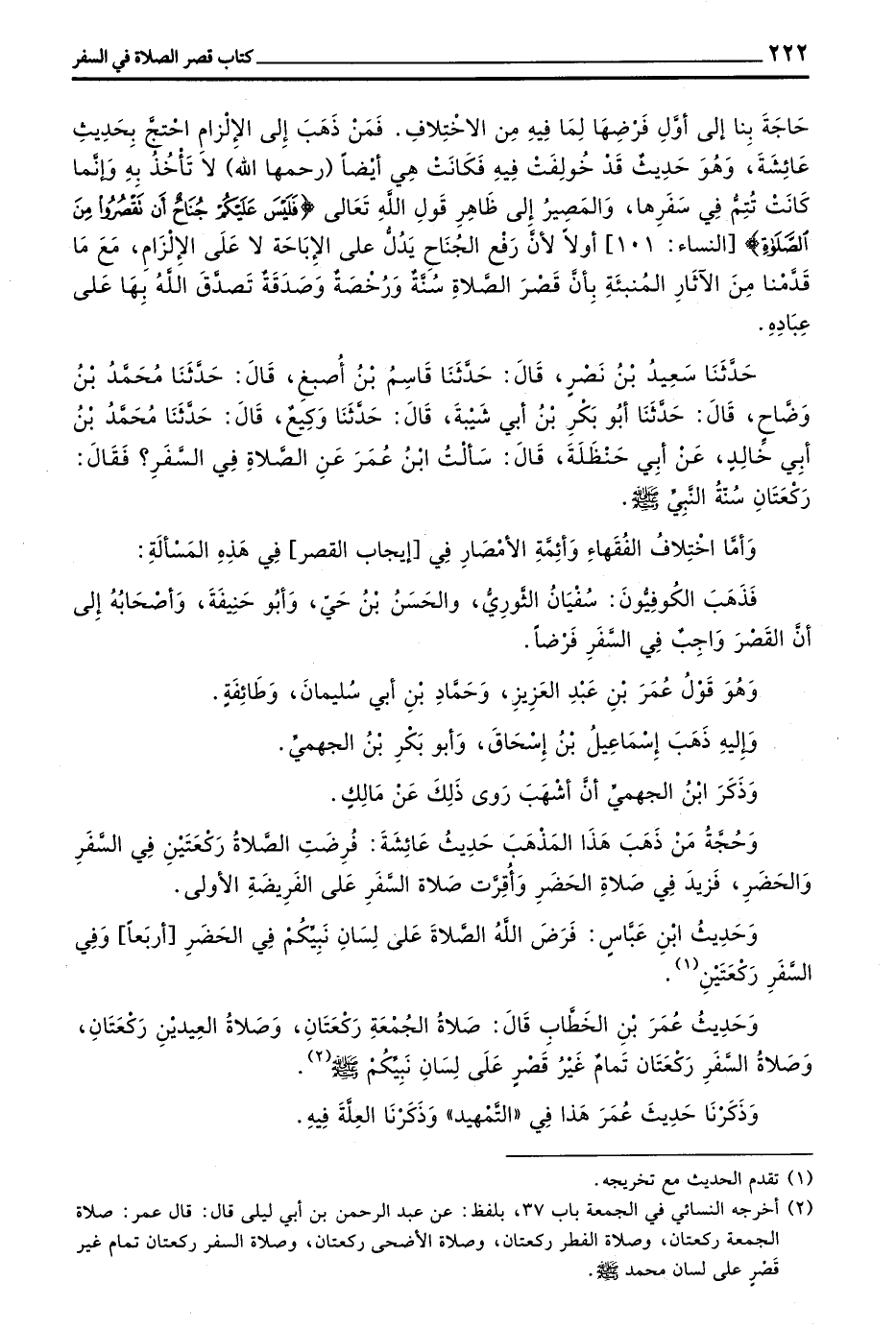 وَحَدِيثُ عُمَرَ بْنِ الْخَطَّابِ قَالَ صَلَاةُ الْجُمُعَةِ رَكْعَتَانِ وَصَلَاةُ الْعِيدَيْنِ رَكْعَتَانِ وَصَلَاةُ السَّفَرِ رَكْعَتَانِ تَمَامٌ غَيْرُ قَصْرٍ عَلَى لِسَانِ نَبِيِّكُمْ صَلَّى اللَّهُ عَلَيْهِ وَسَلَّمَ