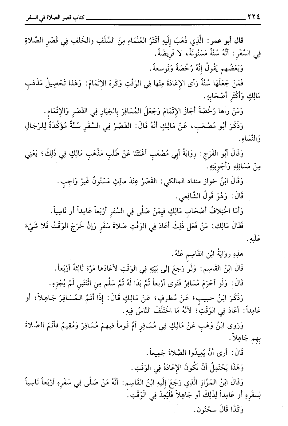 قَالَ أَبُو عُمَرَ الَّذِي ذَهَبَ إِلَيْهِ أَكْثَرُ الْعُلَمَاءِ مِنَ السَّلَفِ وَالْخَلَفِ فِي قَصْرِ الصَّلَاةِ فِي السَّفَرِ أَنَّهُ سُنَّةٌ مَسْنُونَةٌ لَا فَرِيضَةٌ