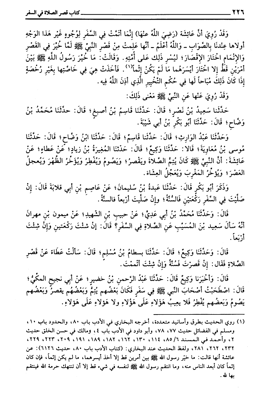 وَقَدْ رُوِيَ أَنَّ عَائِشَةَ (رَضِيَ اللَّهُ عَنْهَا) إِنَّمَا أَتَمَّتْ فِي السَّفَرِ لِوُجُوهٍ غَيْرِ هَذَا الْوَجْهِ أَوْلَاهَا عِنْدَنَا بِالصَّوَابِ وَاللَّهُ أَعْلَمُ أَنَّهَا عَلِمَتْ مِنْ قَصْرِ النَّبِيِّ صَلَّى اللَّهُ عَلَيْهِ وَسَلَّمَ لَمَّا خُيِّرَ فِي الْقَصْرِ وَالْإِتْمَامِ اخْتَارَ الْإِقْصَارَ لِيُسْرِ ذَلِكَ عَلَى أُمَّتِهِ وَقَالَتْ مَا خُيِّرَ رَسُولُ اللَّهِ صَلَّى اللَّهُ عَلَيْهِ وَسَلَّمَ بَيْنَ أَمْرَيْنِ قَطُّ إِلَّا اخْتَارَ أَيْسَرَهُمَا مَا لَمْ يَكُنْ إِثْمًا فَأَخَذَتْ هِيَ فِي خَاصَّتِهَا بِغَيْرِ رُخْصَةٍ إِذَا كَانَ ذَلِكَ مُبَاحًا لَهَا فِي حُكْمِ التَّخْيِيرِ الَّذِي أَذِنَ اللَّهُ فِيهِ