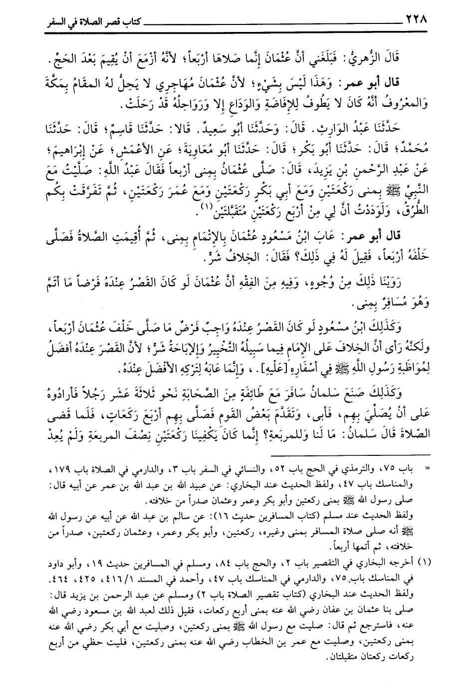 رَوَيْنَا ذَلِكَ مِنْ وُجُوهٍ وَفِيهِ مِنَ الْفِقْهِ أَنَّ عُثْمَانَ لَوْ كَانَ الْقَصْرُ عِنْدَهُ فَرْضًا مَا أَتَمَّ وَهُوَ مُسَافِرٌ بمنى