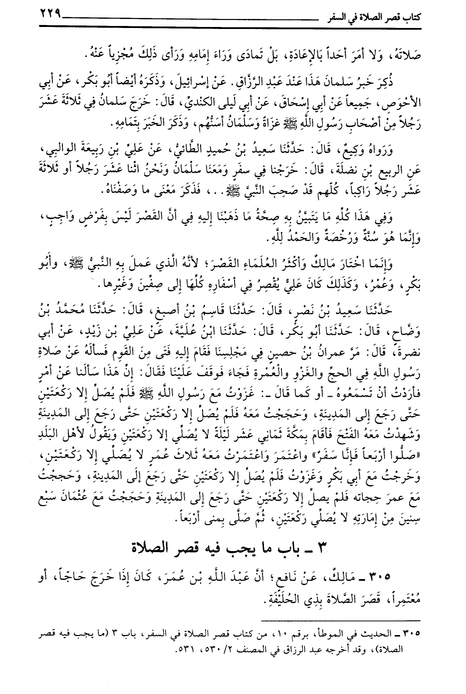 305 - مَالِكٌ عَنْ نَافِعٍ أَنَّ عَبْدَ اللَّهِ بْنَ عُمَرَ كَانَ إِذَا خَرَجَ حَاجًّا أَوْ مُعْتَمِرًا قَصَرَ الصَّلَاةَ بِذِي الحليفة