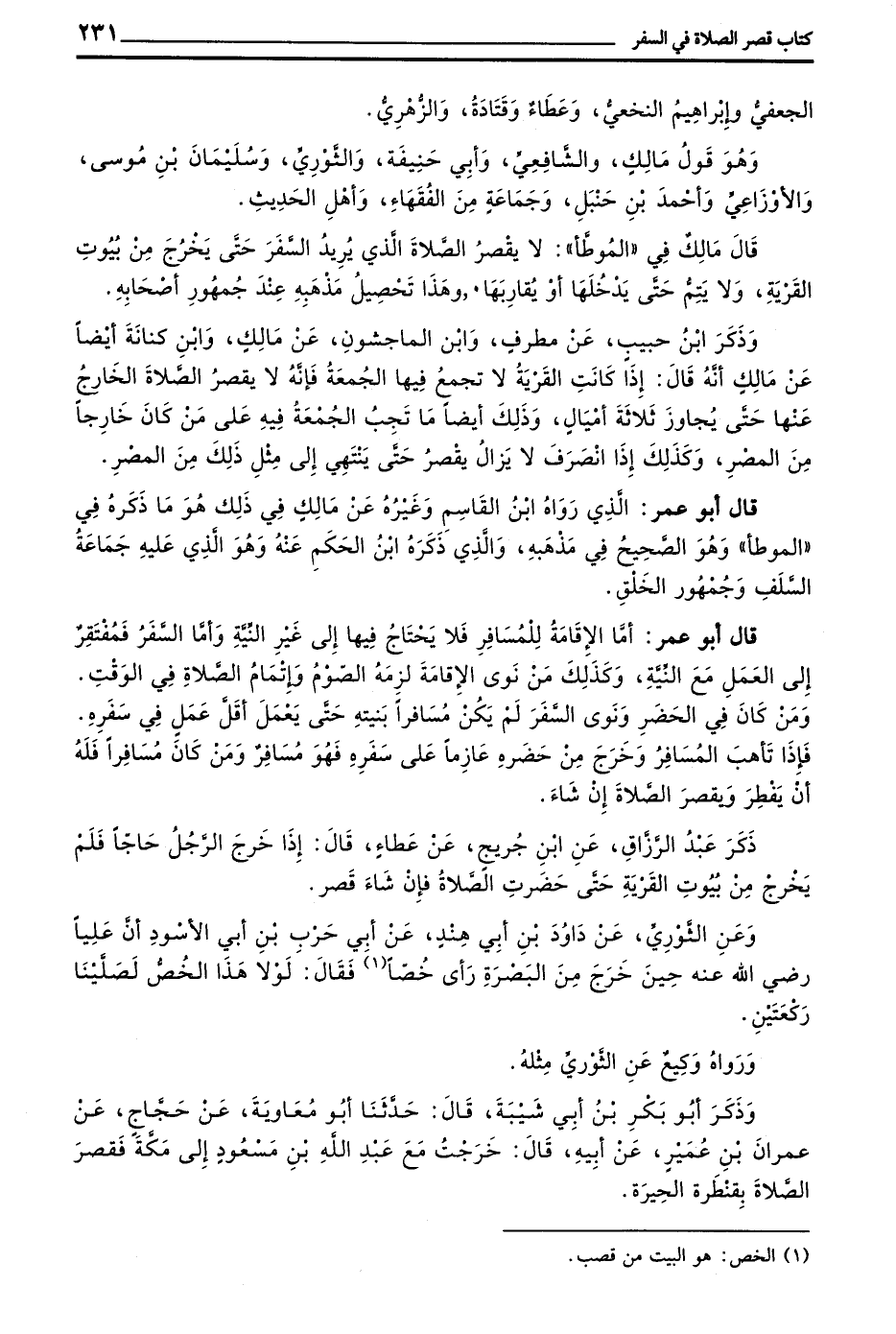 قَالَ مَالِكٌ فِي الْمُوَطَّأِ لَا يَقْصُرُ الصَّلَاةَ الَّذِي يُرِيدُ السَّفَرَ حَتَّى يَخْرُجَ مِنْ بُيُوتِ الْقَرْيَةِ وَلَا يُتِمُّ حَتَّى يَدْخُلَهَا أَوْ يُقَارِبَهَا وَهَذَا تَحْصِيلُ مَذْهَبِهِ عند جمهور أصحابه