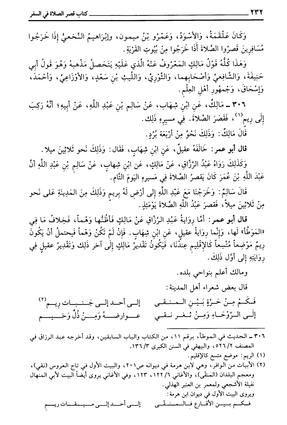 306 - مالك عن بن شِهَابٍ عَنْ سَالِمِ بْنِ عَبْدِ اللَّهِ عَنْ أَبِيهِ أَنَّهُ رَكِبَ إِلَى رِيمٍ فَقَصَرَ الصَّلَاةَ فِي مَسِيرَةِ ذَلِكَ