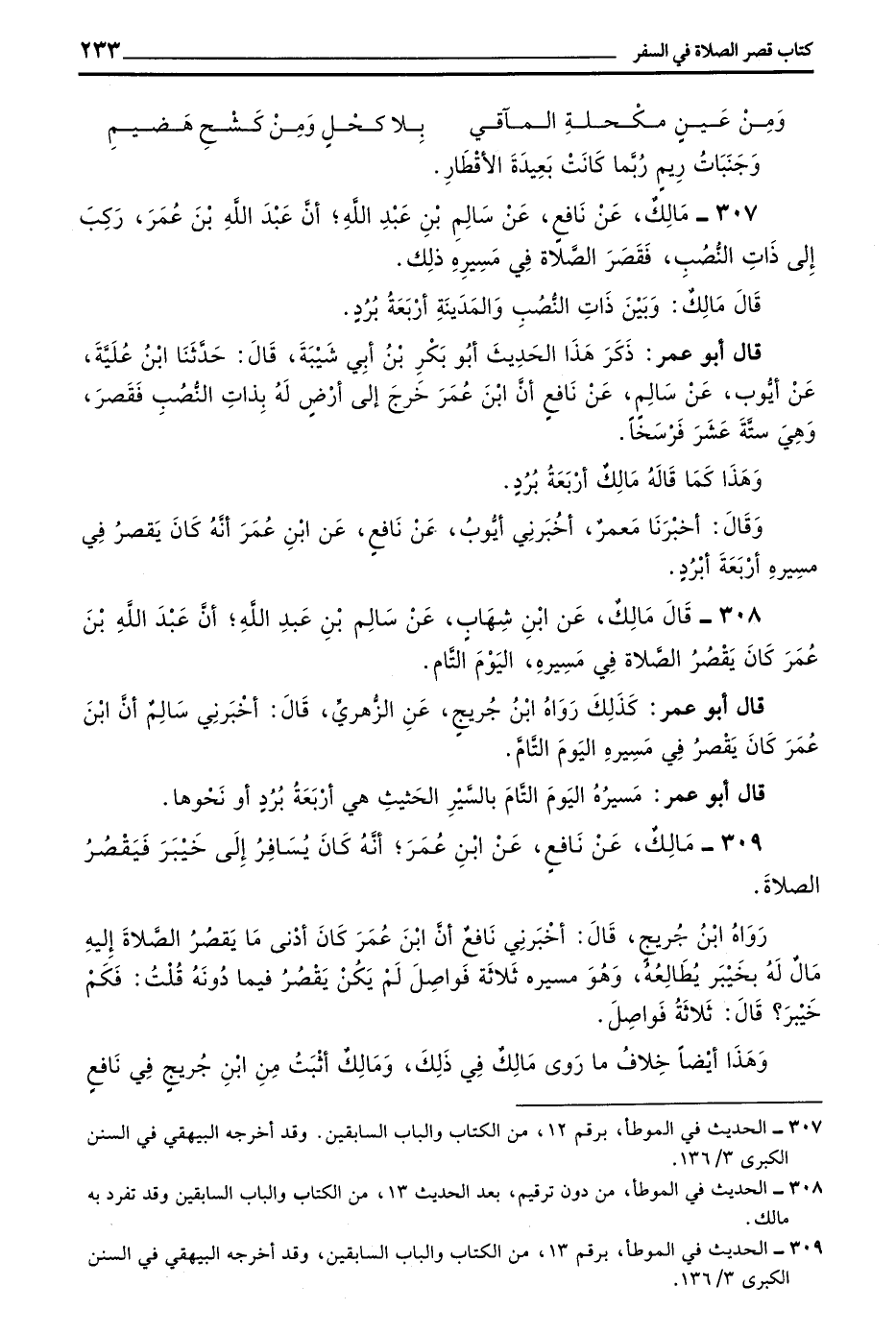 308 - قال مالك عن بن شِهَابٍ عَنْ سَالِمِ بْنِ عَبْدِ اللَّهِ أَنَّ عَبْدَ اللَّهِ بْنَ عُمَرَ كَانَ يَقْصُرُ الصَّلَاةَ فِي مَسِيرِهِ الْيَوْمَ التَّامَّ