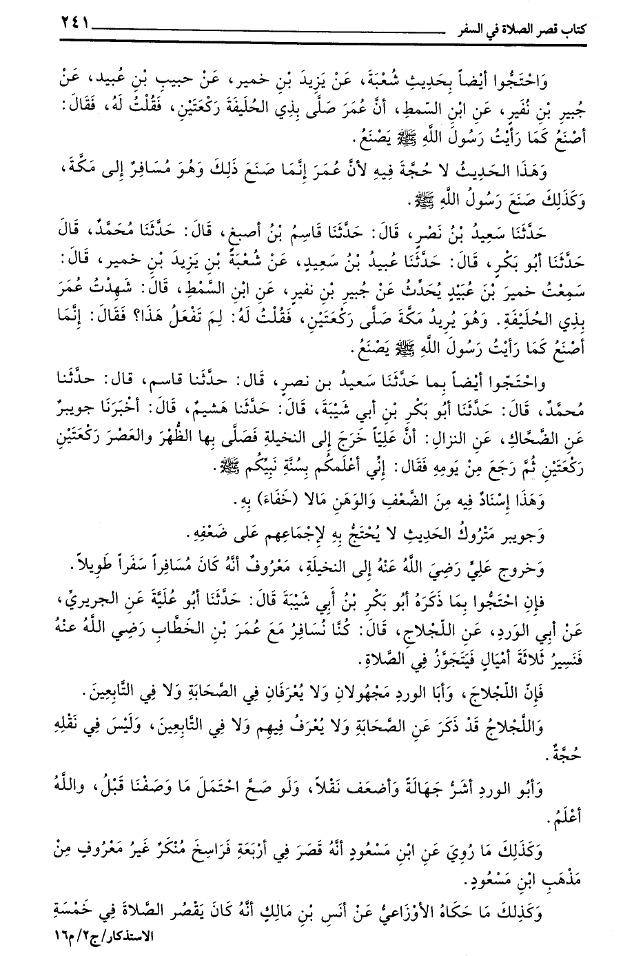 وَاحْتَجُّوا أَيْضًا بِحَدِيثِ شُعْبَةَ عَنْ يَزِيدَ بْنِ خُمَيْرٍ عَنْ حَبِيبِ بْنِ عُبَيْدٍ عَنْ جُبَيْرِ بن نفير عن بن السِّمْطِ أَنَّ عُمَرَ صَلَّى بِذِي الْحُلَيْفَةِ رَكْعَتَيْنِ فَقُلْتُ لَهُ فَقَالَ أَصْنَعُ كَمَا رَأَيْتُ رَسُولَ اللَّهِ صَلَّى اللَّهُ عَلَيْهِ وَسَلَّمَ يَصْنَعُ
