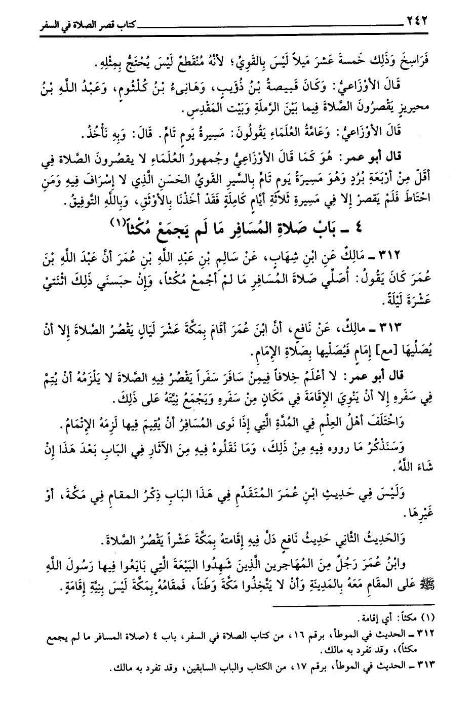 312 - مالك عن بن شِهَابٍ عَنْ سَالِمِ بْنِ عَبْدِ اللَّهِ بْنِ عُمَرَ أَنَّ عَبْدَ اللَّهِ بْنَ عُمَرَ كَانَ يَقُولُ أُصَلِّي صَلَاةَ الْمُسَافِرِ مَا لَمْ أَجْمَعْ مُكْثًا وَإِنْ حَبَسَنِي ذَلِكَ اثْنَتَيْ عَشْرَةَ لَيْلَةً