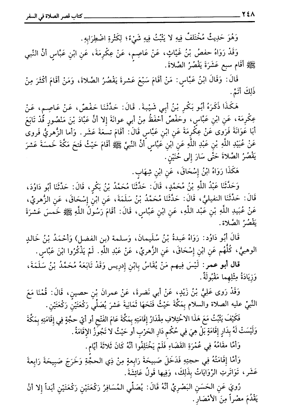 هَكَذَا ذَكَرَهُ أَبُو بَكْرِ بْنُ أَبِي شَيْبَةَ قَالَ حَدَّثَنَا حَفْصٌ عَنْ عَاصِمٍ عَنْ عِكْرِمَةَ عَنِ بن عَبَّاسٍ وَحَفْصٌ أَحْفَظُ مِنْ أَبِي عَوَانَةَ إِلَّا أَنَّ عَبَّادَ بْنَ مَنْصُورٍ قَدْ تَابَعَ أَبَا عوانة فروى عن عكرمة عن بن عَبَّاسٍ قَالَ أَقَامَ تِسْعَةَ عَشَرَ وَأَمَّا الزُّهْرِيُّ فَرَوَى عَنْ عُبَيْدِ اللَّهِ بْنِ عَبْدِ اللَّهِ عَنِ بن عَبَّاسٍ أَنَّ النَّبِيَّ صَلَّى اللَّهُ عَلَيْهِ وَسَلَّمَ أَقَامَ حَيْثُ فَتَحَ مَكَّةَ خَمْسَةَ عَشَرَ يَقْصُرُ الصَّلَاةَ حَتَّى سَارَ إِلَى حَنِينٍ