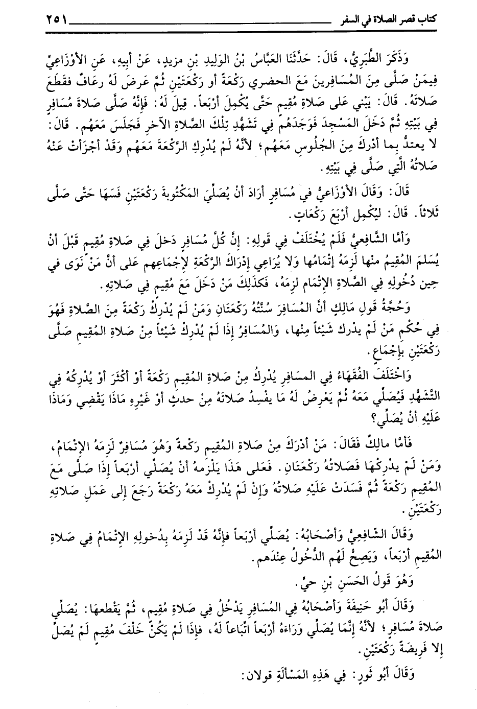 وَذَكَرَ الطَّبَرِيُّ قَالَ حَدَّثَنَا الْعَبَّاسُ بْنُ الْوَلِيدِ بْنِ مَزْيَدٍ عَنْ أَبِيهِ عَنِ الْأَوْزَاعِيِّ فِيمَنْ صَلَّى مِنَ الْمُسَافِرِينَ مَعَ الْحَضَرِيِّ رَكْعَةً أَوْ رَكْعَتَيْنِ ثُمَّ عَرَضَ لَهُ رُعَافٌ فَقَطَعَ صَلَاتَهُ قَالَ يَبْنِي عَلَى صَلَاةِ مُقِيمٍ حَتَّى يُكْمِلَ أَرْبَعًا قِيلَ لَهُ فَإِنَّهُ صَلَّى صَلَاةَ مُسَافِرٍ فِي بَيْتِهِ ثُمَّ دَخَلَ الْمَسْجِدَ فَوَجَدَهُمْ فِي تَشَهُّدِ تِلْكَ الصَّلَاةِ الْآخِرِ فَجَلَسَ مَعَهُمْ قَالَ لَا يُعْتَدُّ بِمَا أَدْرَكَ مِنَ الْجُلُوسِ مَعَهُمْ لِأَنَّهُ لَمْ يُدْرِكِ الرَّكْعَةَ مَعَهُمْ وَقَدْ أَجْزَأَتْ عَنْهُ صَلَاتُهُ الَّتِي صَلَّى فِي بَيْتِهِ