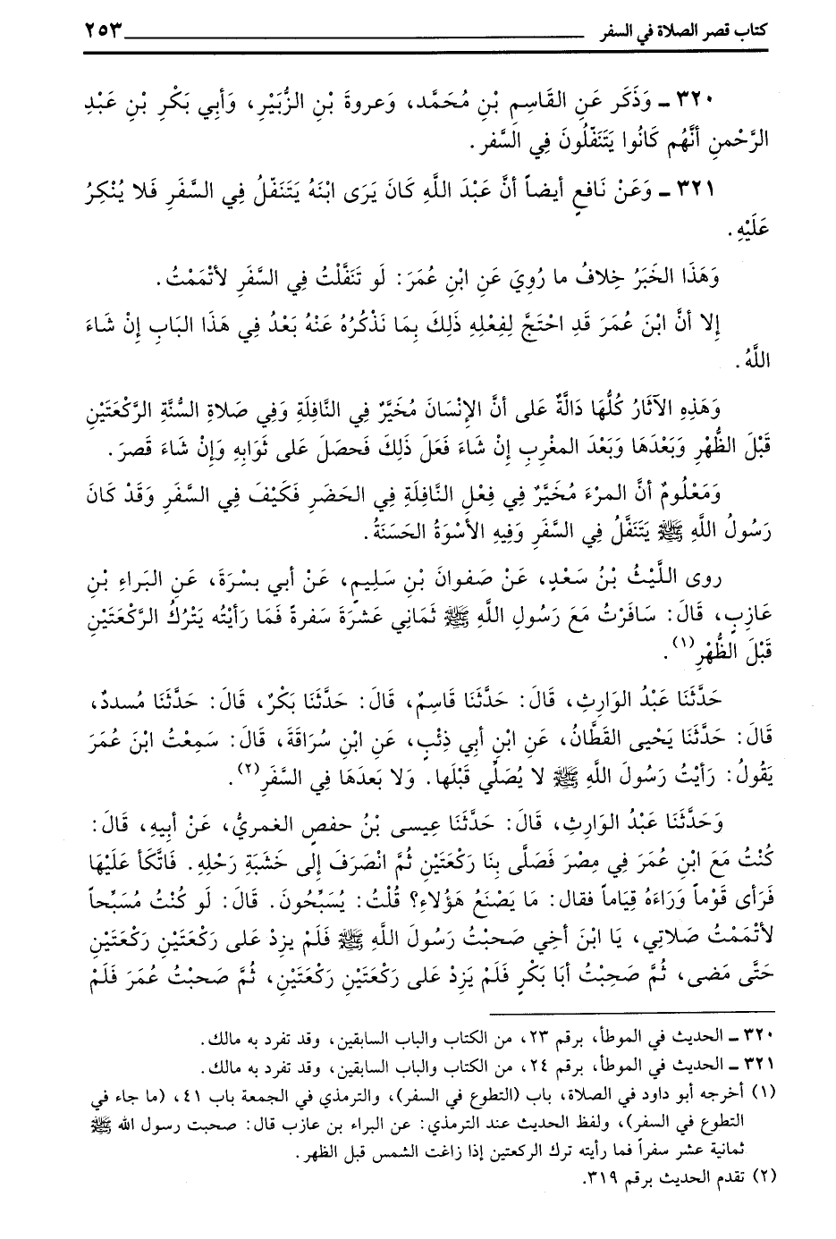 320 - وَذَكَرَ عَنِ الْقَاسِمِ بْنِ مُحَمَّدٍ وَعُرْوَةَ بْنِ الزُّبَيْرِ وَأَبِي بَكْرِ بْنِ عَبْدِ الرَّحْمَنِ أَنَّهُمْ كَانُوا يَتَنَفَّلُونَ فِي السَّفَرِ