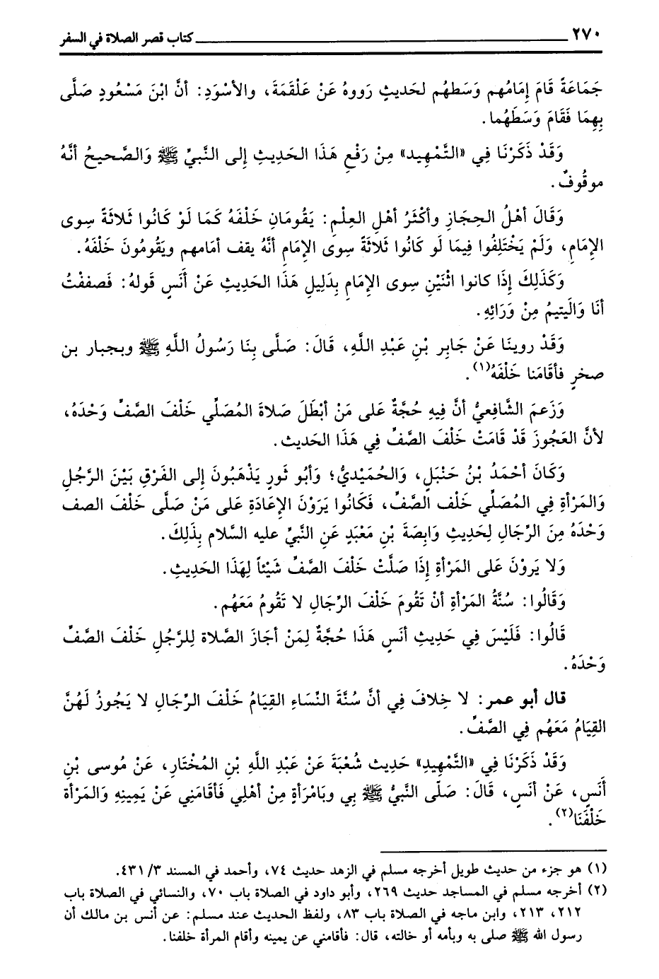 قَالَ أَبُو عُمَرَ لَا خِلَافَ فِي أَنَّ سُنَّةَ النِّسَاءِ الْقِيَامُ خَلْفَ الرِّجَالِ لَا يَجُوزُ لَهُنَّ الْقِيَامُ مَعَهُمْ فِي الصَّفِّ