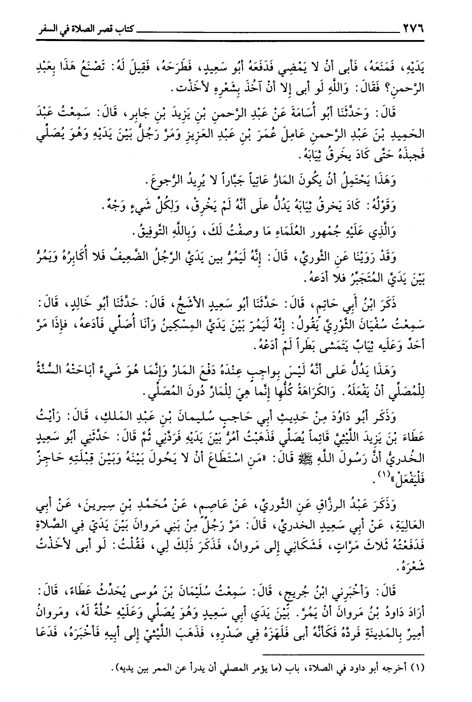 ذكر بن أَبِي حَاتِمٍ قَالَ حَدَّثَنَا أَبُو سَعِيدٍ الْأَشَجُّ قَالَ حَدَّثَنَا أَبُو خَالِدٍ قَالَ سَمِعْتُ سُفْيَانَ الثَّوْرِيَّ يَقُولُ إِنَّهُ لَيَمُرُّ بَيْنَ يَدِي الْمِسْكِينُ وَأَنَا أُصَلِّي فَأَدَعُهُ فَإِذَا مَرَّ أَحَدٌ وَعَلَيْهِ ثِيَابٌ يَتَمَشَّى بَطَرًا لَمْ أَدَعْهُ