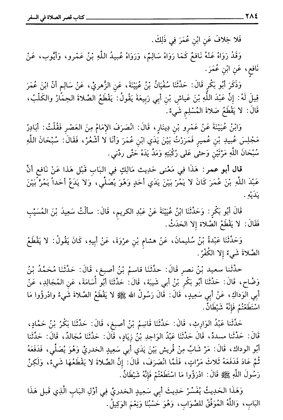 وَذَكَرَ أَبُو بَكْرٍ قَالَ حَدَّثَنَا سُفْيَانُ بْنُ عُيَيْنَةَ عَنِ الزُّهْرِيِّ عَنْ سَالِمٍ أَنَّ بن عُمَرَ قِيلَ لَهُ إِنَّ عَبْدَ اللَّهِ بْنَ عَيَّاشِ بْنِ أَبِي رَبِيعَةَ يَقُولُ يَقْطَعُ الصَّلَاةَ الْحِمَارُ وَالْكَلْبُ قَالَ لَا يَقْطَعُ صَلَاةَ الْمُسْلِمِ شيء