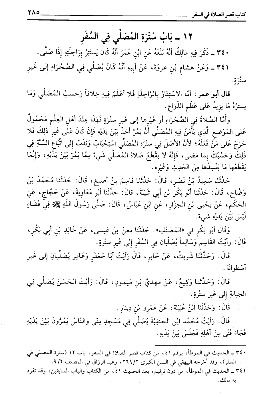 341 - وَعَنْ هِشَامِ بْنِ عُرْوَةَ عَنْ أَبِيهِ أَنَّهُ كَانَ يُصَلِّي فِي الصَّحْرَاءِ إِلَى غَيْرِ سُتْرَةٍ