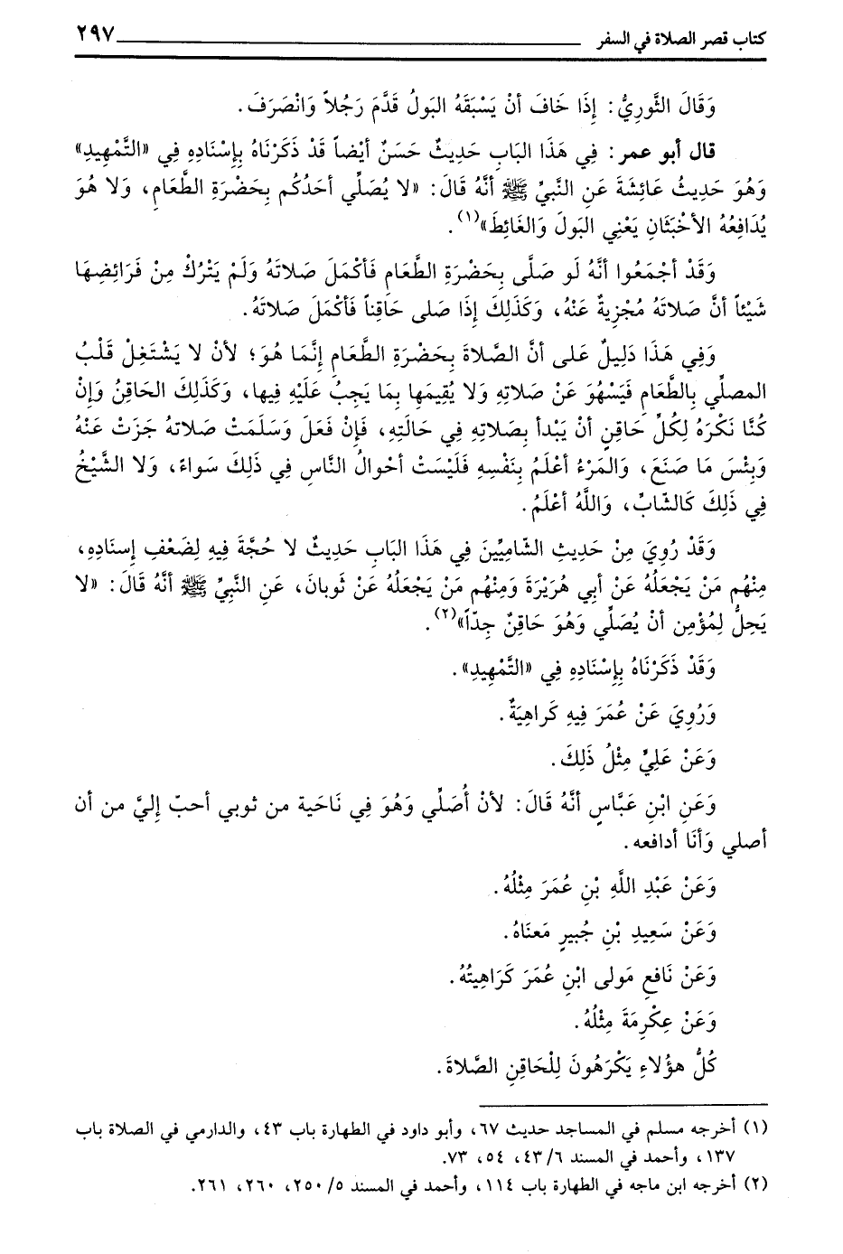 قَالَ أَبُو عُمَرَ فِي هَذَا الْبَابِ حَدِيثٌ حَسَنٌ أَيْضًا قَدْ ذَكَرْنَاهُ بِإِسْنَادِهِ فِي التَّمْهِيدِ وَهُوَ حَدِيثِ عَائِشَةَ عَنِ النَّبِيِّ صَلَّى اللَّهُ عَلَيْهِ وَسَلَّمَ أَنَّهُ قَالَ لَا يُصَلِّي أَحَدُكُمْ بِحَضْرَةِ الطَّعَامِ وَلَا هُوَ يُدَافِعُهُ الْأَخْبَثَانِ يَعْنِي الْبَوْلَ وَالْغَائِطَ