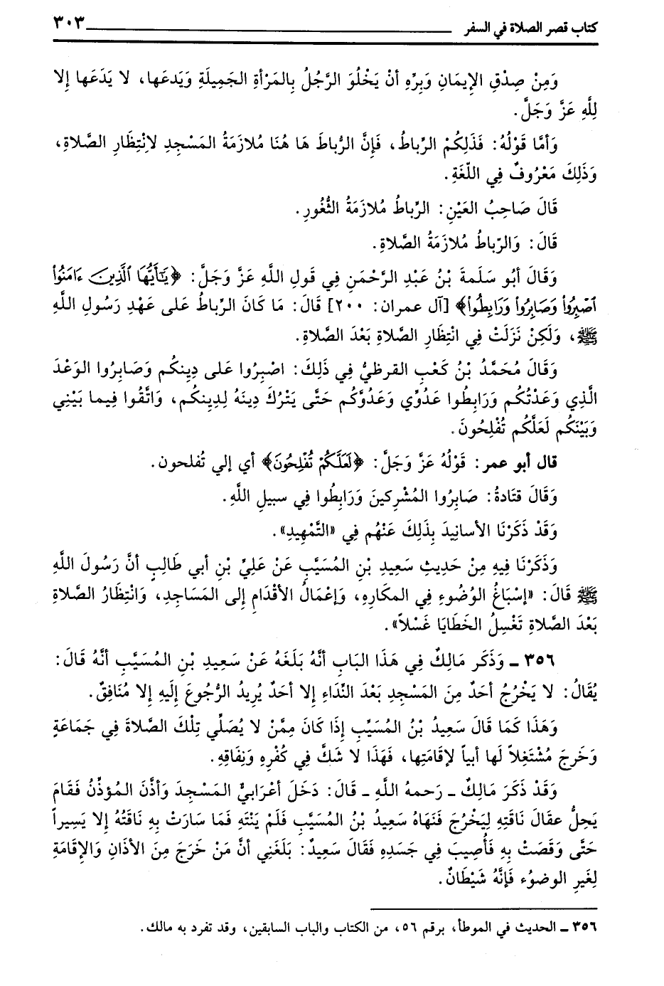 وَقَالَ أَبُو سَلَمَةَ بْنُ عَبْدِ الرَّحْمَنِ فِي قَوْلِ اللَّهِ عَزَّ وجل (يأيها الذي ءامنوا اصْبِرُوا وَصَابِرُوا وَرَابِطُوا) آلِ عِمْرَانَ 200 قَالَ مَا كَانَ الرِّبَاطُ عَلَى عَهْدِ رَسُولِ اللَّهِ صَلَّى اللَّهُ عَلَيْهِ وَسَلَّمَ وَلَكِنْ نَزَلَتْ فِي انْتِظَارِ الصَّلَاةِ بَعْدَ الصَّلَاةِ