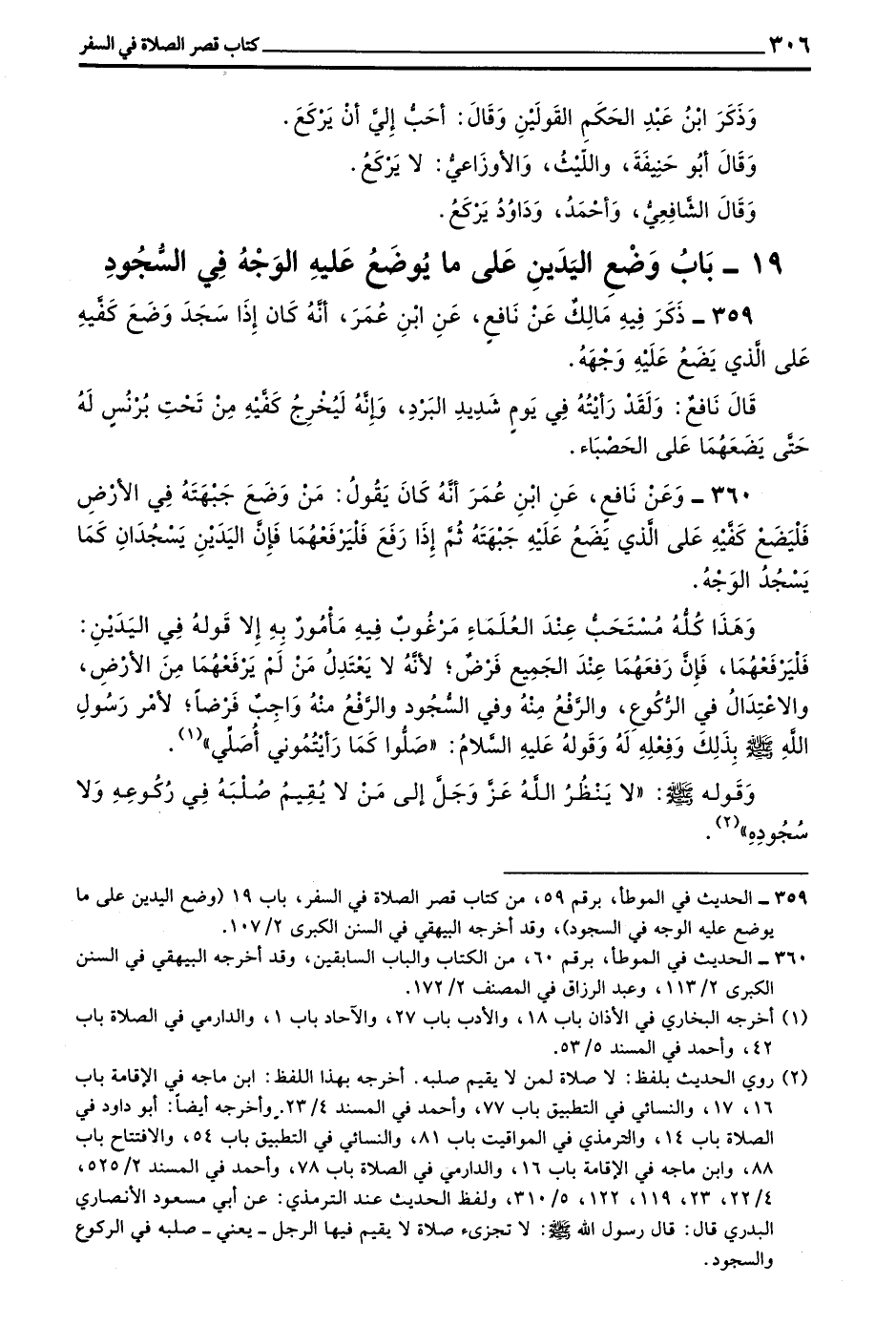 359 - ذَكَرَ فِيهِ مَالِكٌ عَنْ نَافِعٍ عن بن عُمَرَ أَنَّهُ كَانَ إِذَا سَجَدَ وَضَعَ كَفَّيْهِ عَلَى الَّذِي يَضَعُ عَلَيْهِ وَجْهَهُ